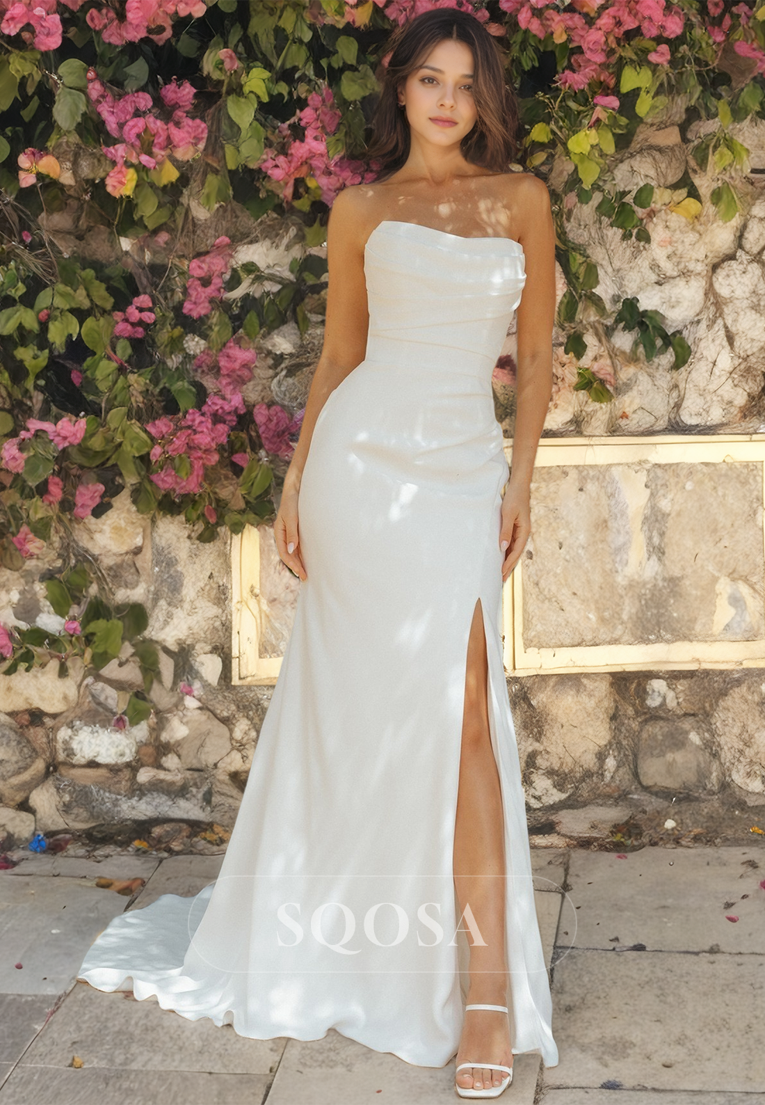 This gorgeous tube top dress features a sleeveless design for a flattering fit. The high split satin material adds a touch of luxury, while the train adds a dramatic element to this boho-inspired dress. Perfect for beach weddings and other special occasions.
