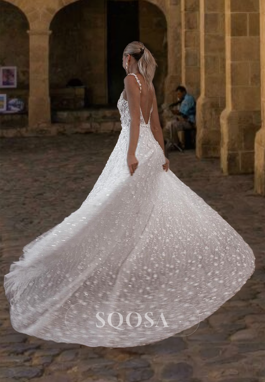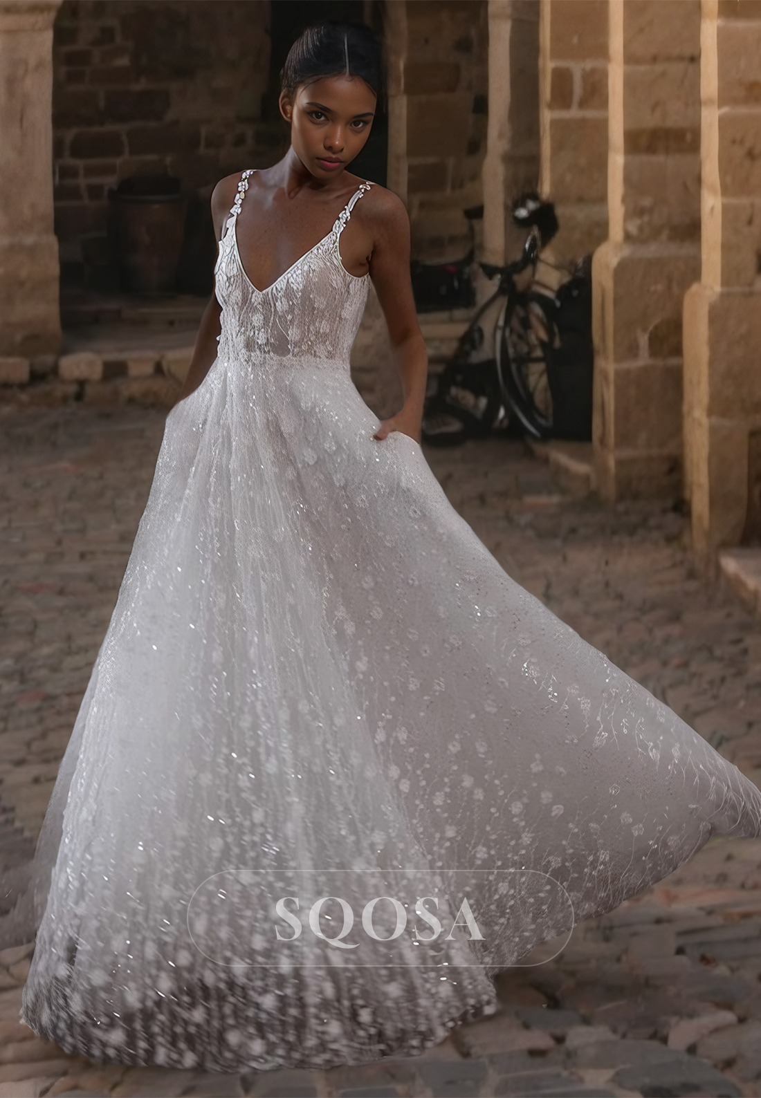 V-Neck Spaghetti Straps Sleeveless Allover Glitter Lace A-Line Wedding Dress with Sweep Train