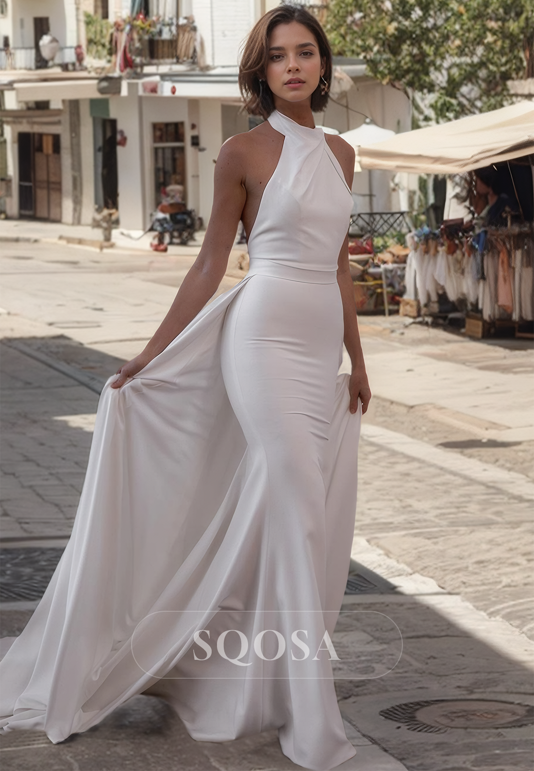 This Sleeveless High-Neck Mermaid Dress is perfect for a beach wedding. The off-shoulder design and sweep train add a touch of elegance, while the high-neck provides a modern twist. With a flattering mermaid silhouette, this dress will make any bride feel beautiful and confident on her special day.