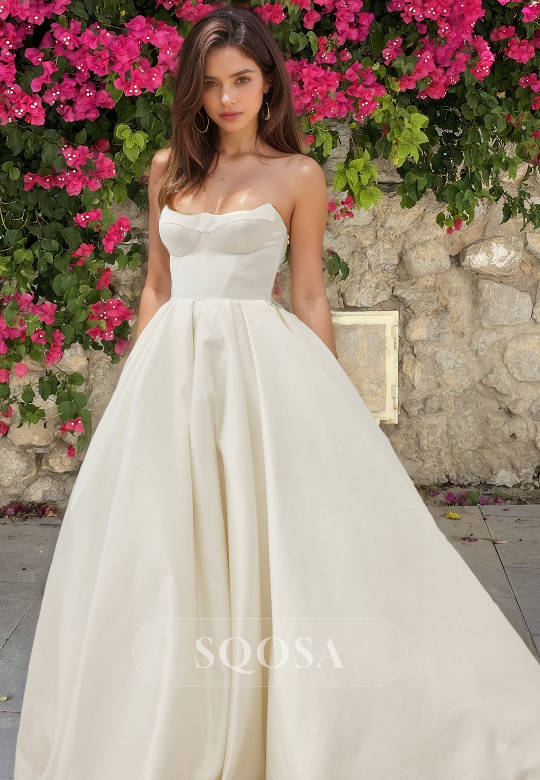 This elegant and timeless wedding gown features a simple sweetheart neckline, sleeveless design, and A-line silhouette for a flattering and classic look. The off-shoulder detail adds a touch of romance, while the luxurious satin material and train bring a sense of sophistication. Perfect for any bride looking for a traditional yet modern dress for her big day.