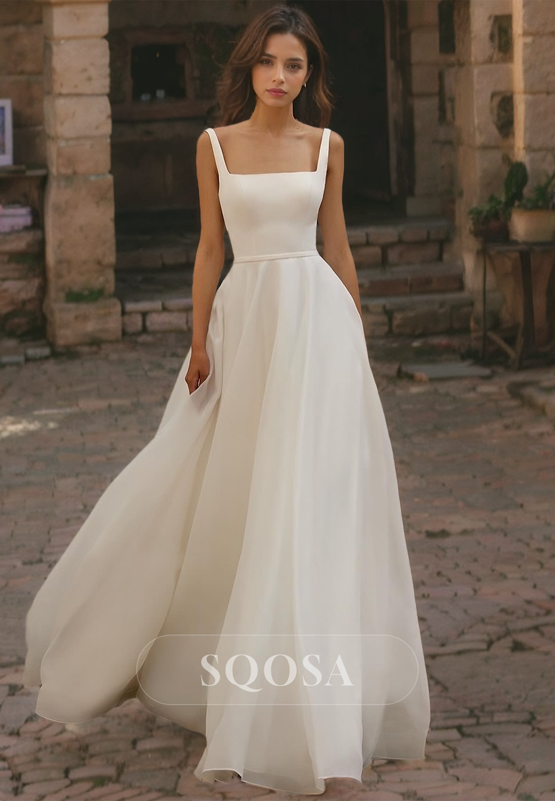 Simple Square-Neck Straps Sleeveless A-Line Chiffon with Sweep Train Beach Wedding Dress