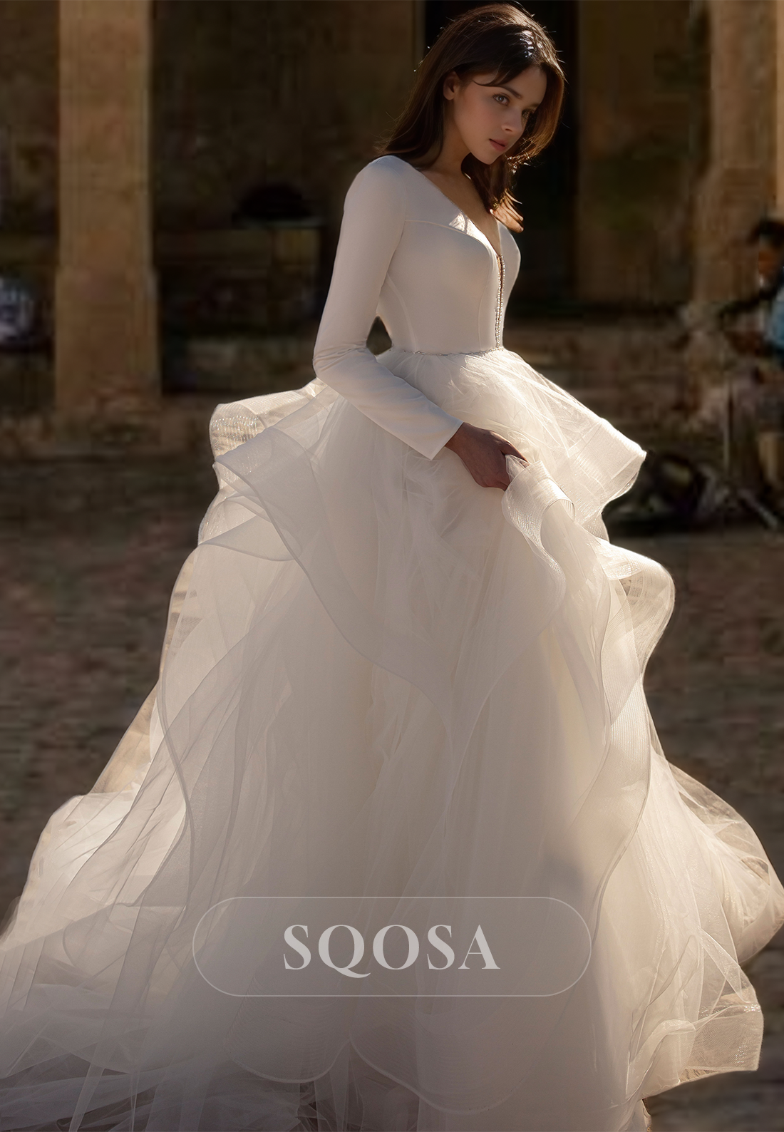 Ornate V-Neck Long Sleeves Wedding Dress A-Line Beaded with Tulle Train Bridal Gowns