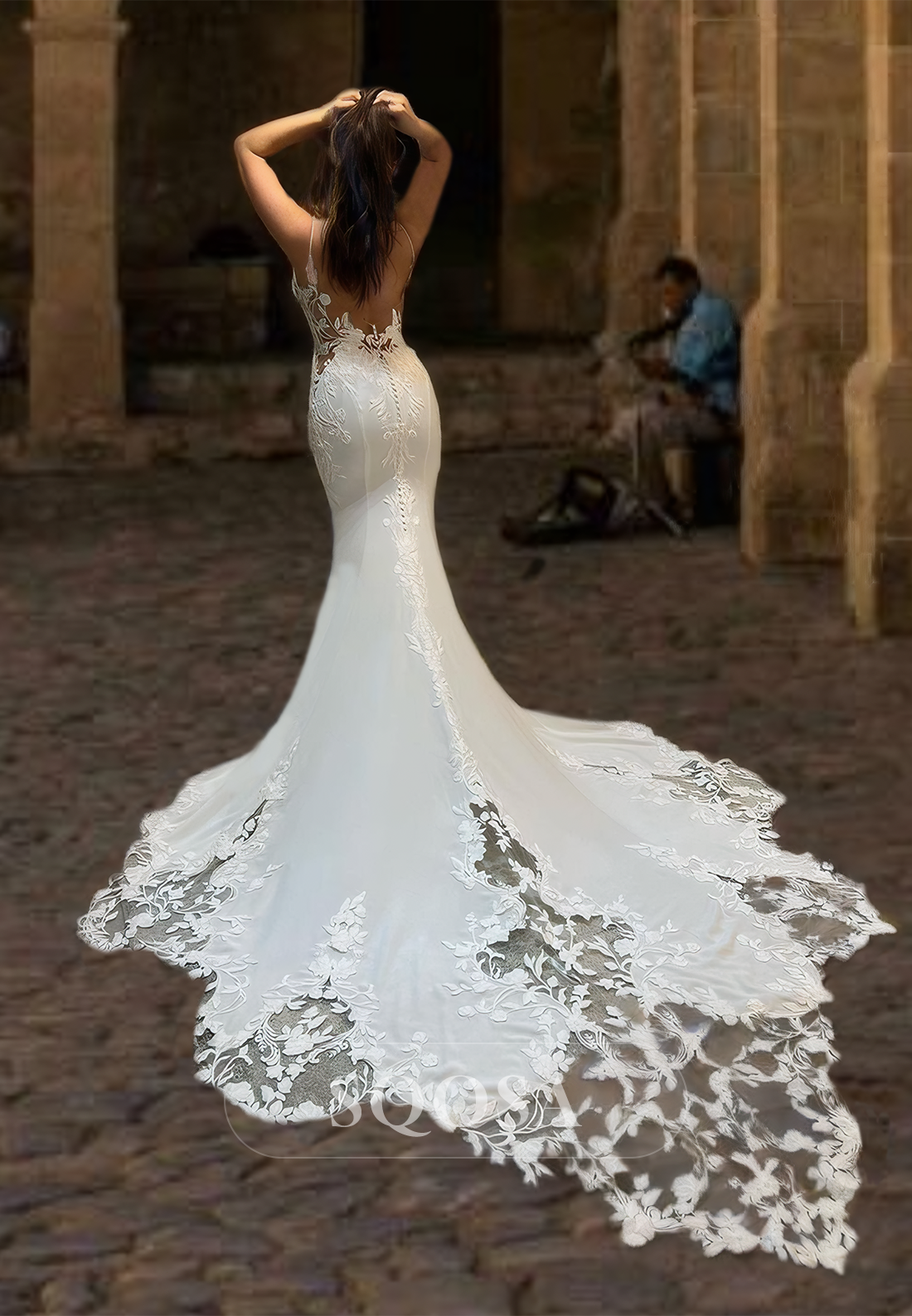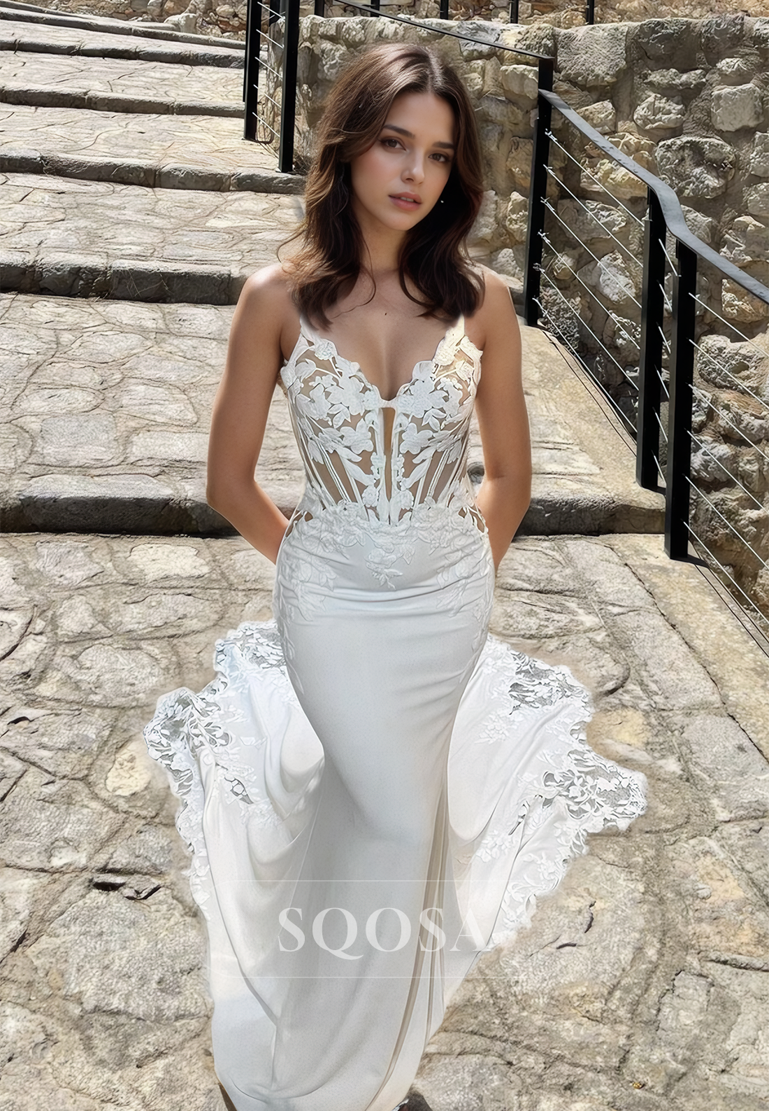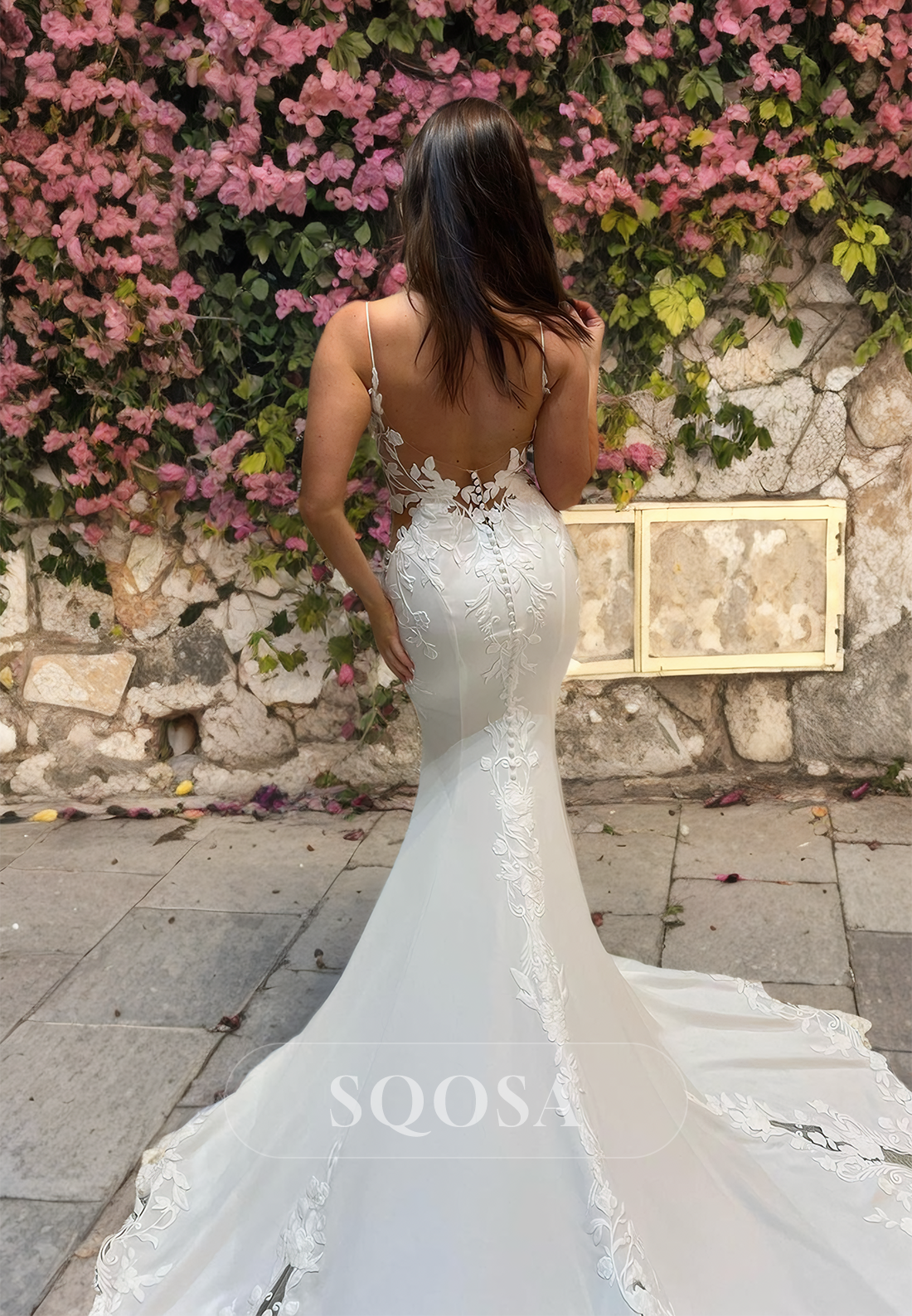 Appliques with Sweep Train Bridal Gowns V-Neck Spaghetti Straps Satin Mermaid Wedding Dress