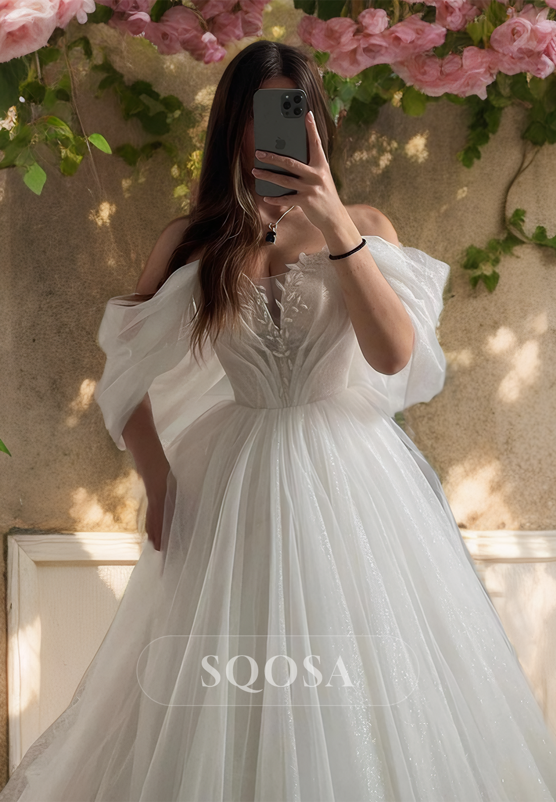 Off-Shoulder V-Neck Sleeveless Lace Bridal Dress Floor Length A-Line Wedding Dress