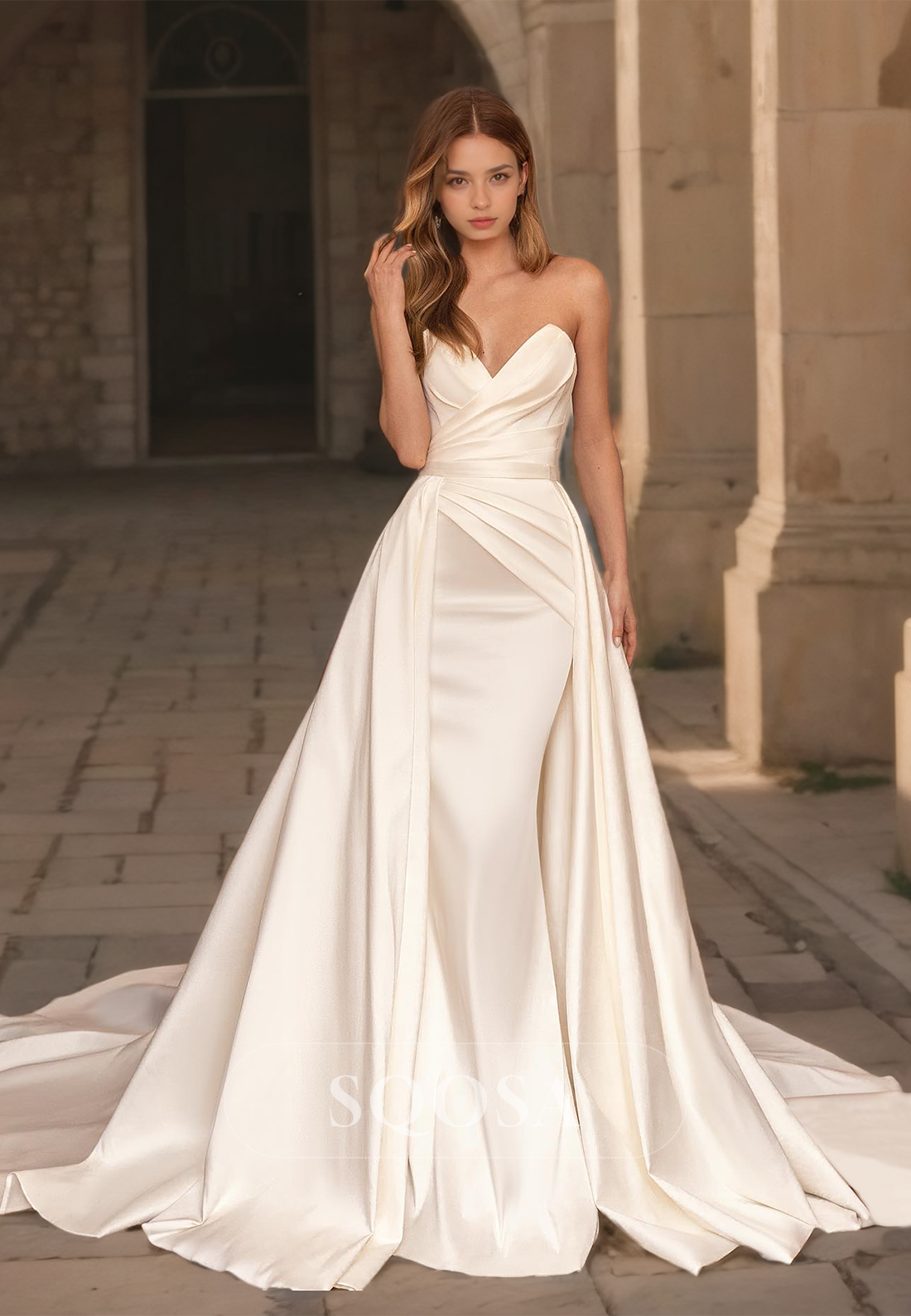 V-Neck Sleeveless Pleated Satin Mermaid Wedding Dress Sweep Train Bridal Dress with Overskirt