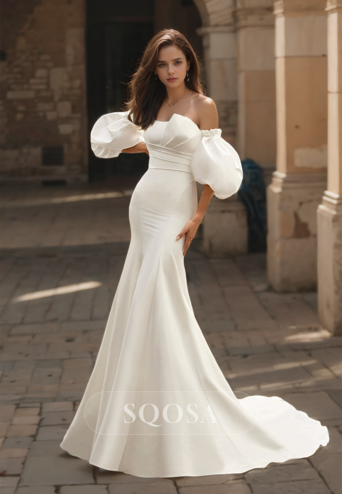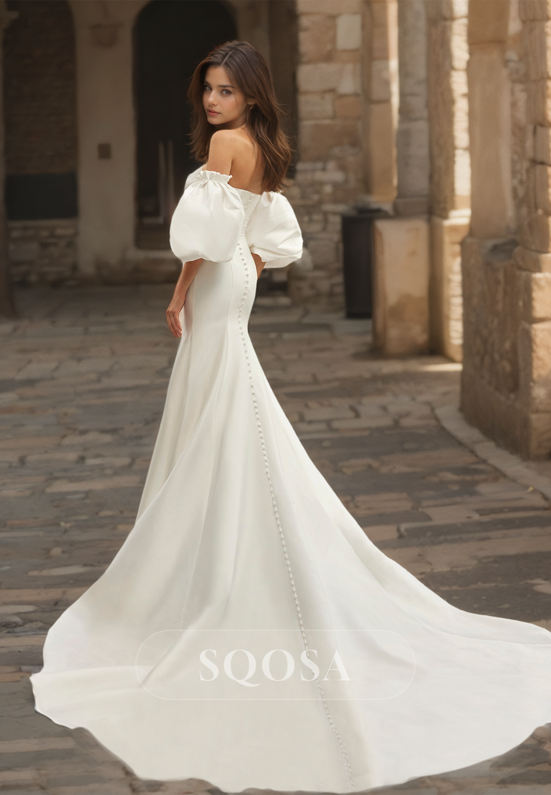 Asymmetrical Neck Satin Mermaid Wedding Dress Puff-Sleeves Pleated with Train Bridal Gowns