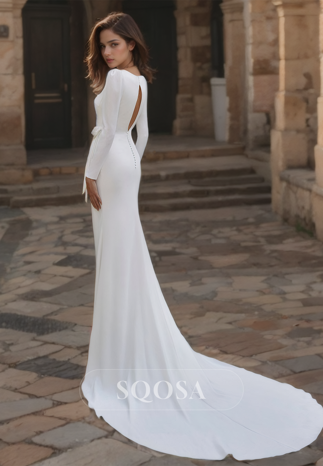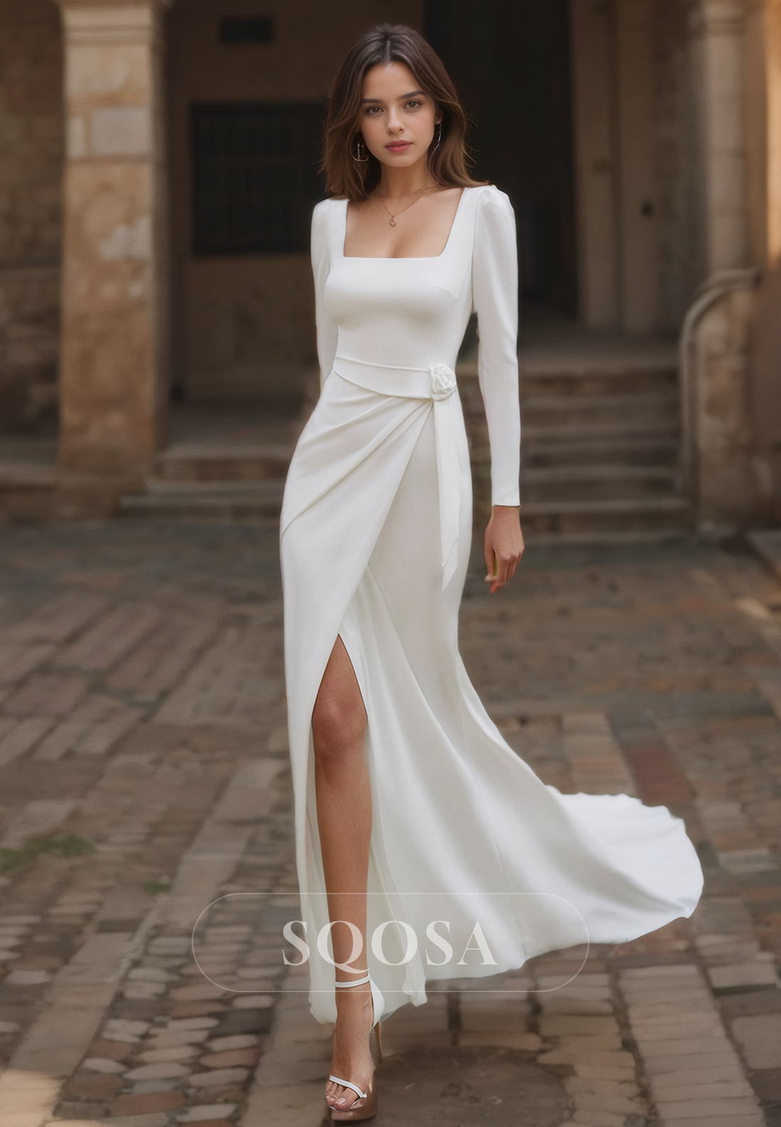 Square-Neck Fitted Beach Wedding Dress Long Sleeves Pleated Satin Boho Wedding Gowns Slit with Train