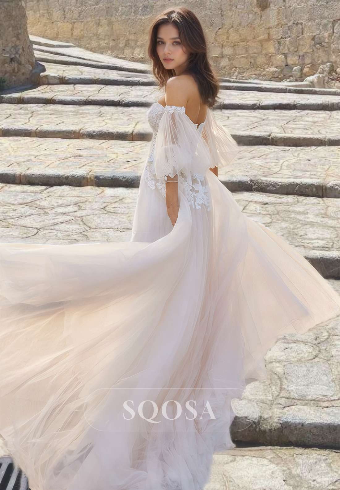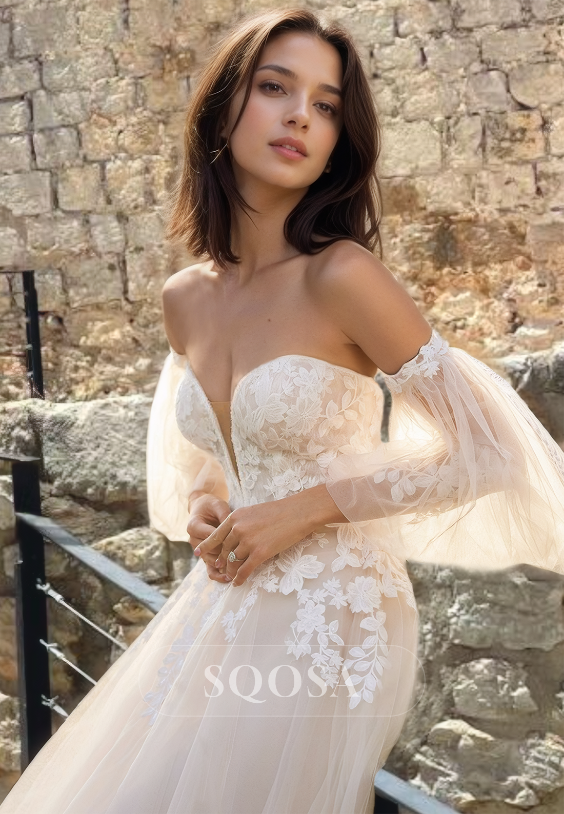 Sweetheart Half-Sleeves A-Line Beach Dress Floor-Length with Lace Appliques Wedding Dress