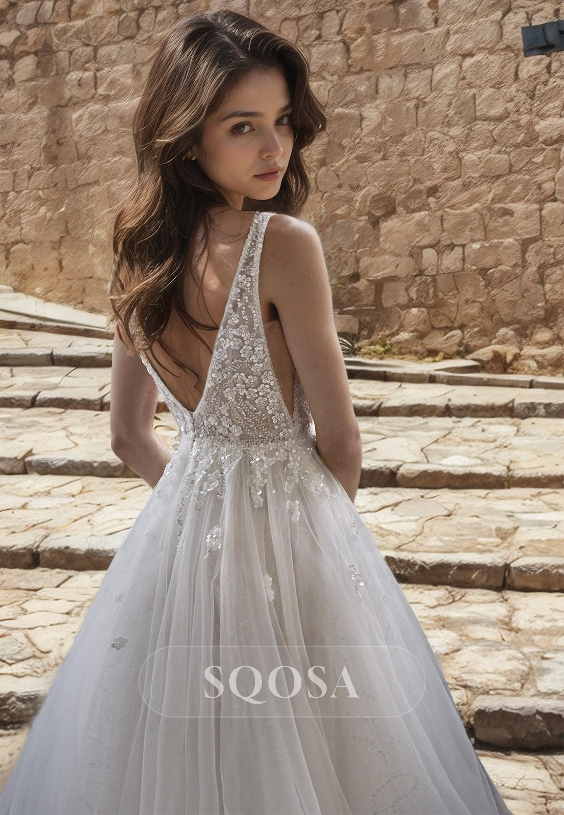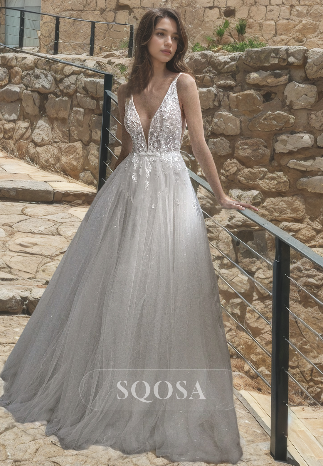 A-Line Deep V-Neck Sequined Boho Wedding Dress Spaghetti Straps Train Beach Gowns with Beaded and Appliques