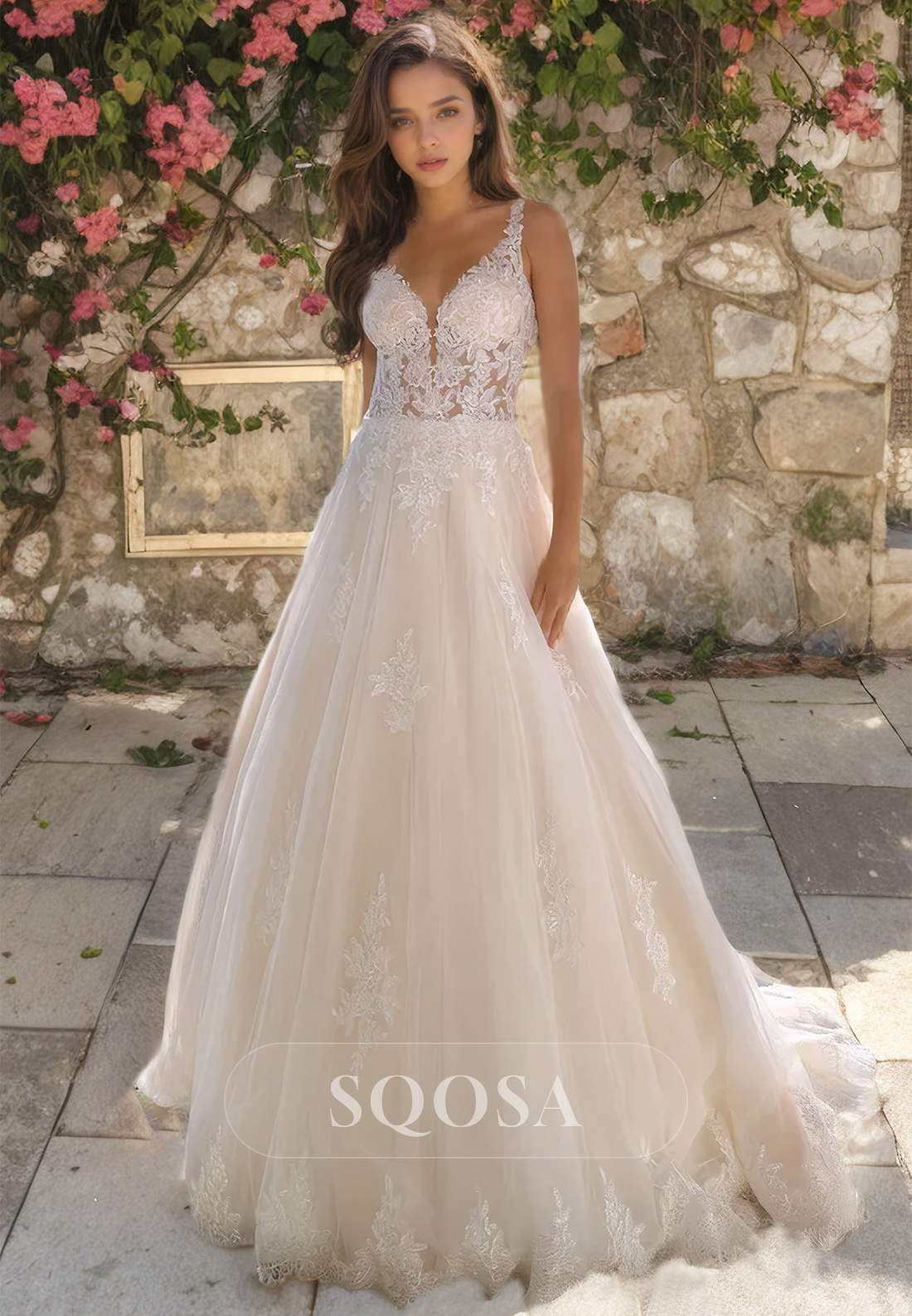 A-Line V-Neck Spaghetti Straps Beach Bridal Dress Lace Appliques Boho Wedding Dress with Sweep Train