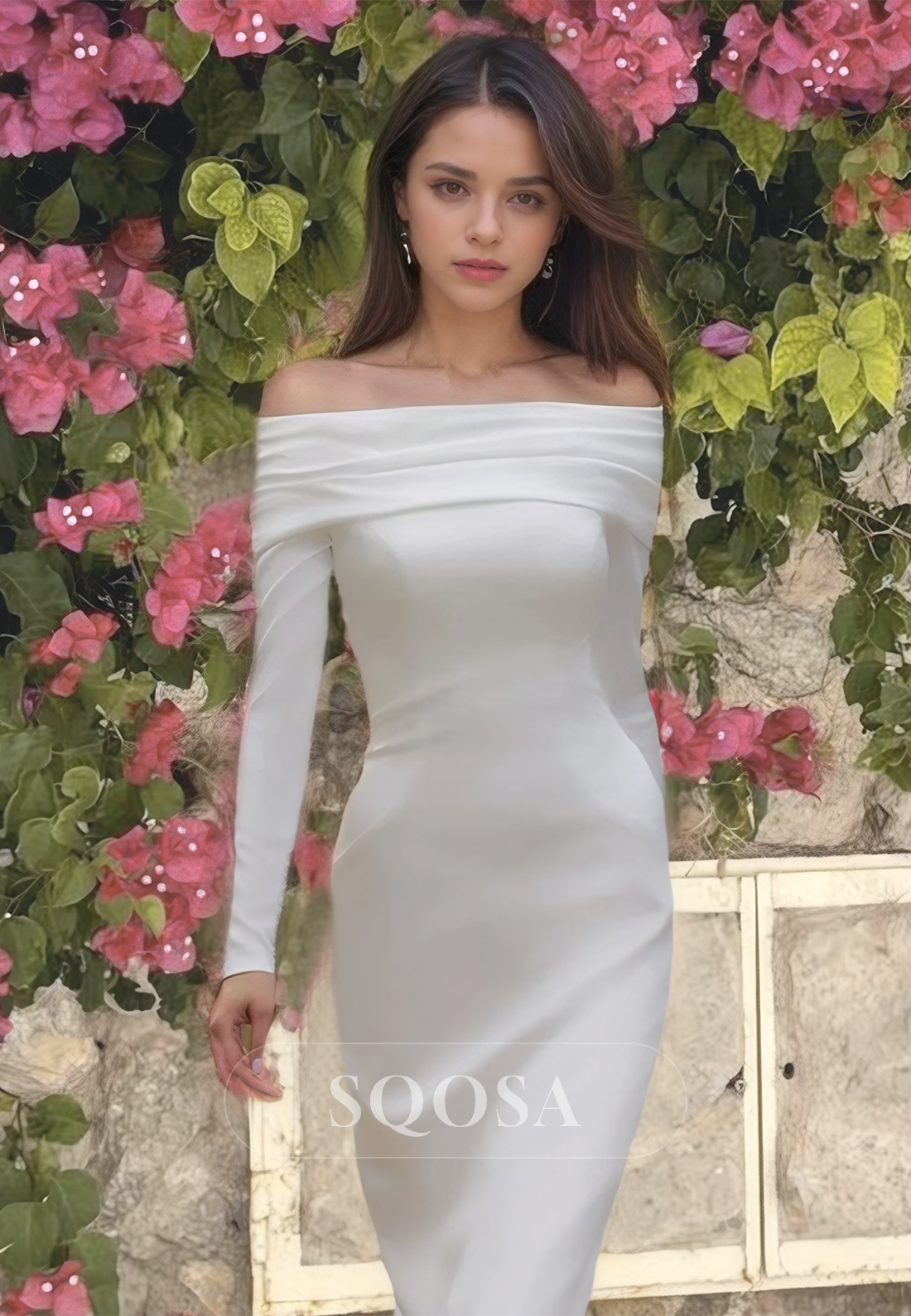 Off-Shoulder Long Sleeves Mermaid Beach Wedding Dress Pleated Satin Slit Boho Bridal Dress