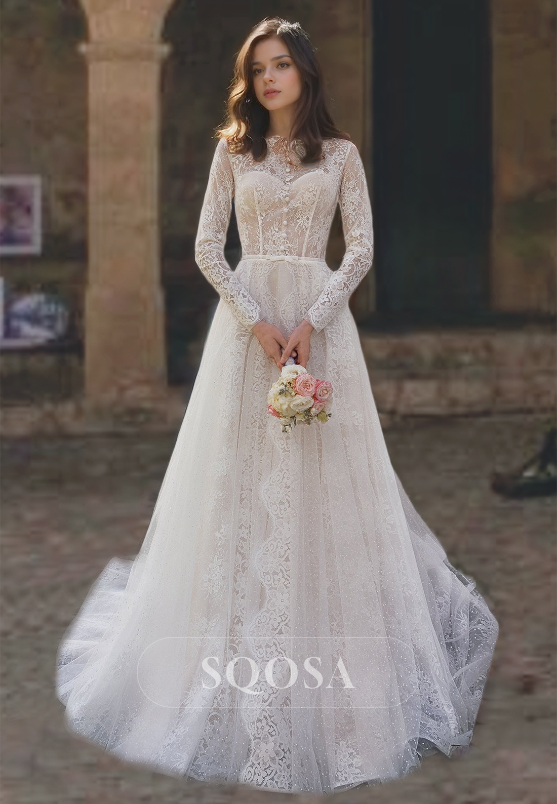 Ornate High-Neck Long Sleeves A-Line Weeding Dress Allover Lace Cutout with Train Bridal Gowns