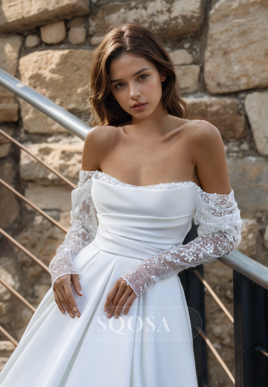 Tube Top Lace Half-Sleeves A-Line Bridal Gowns Pleated and Sequined Satin Wedding Dress