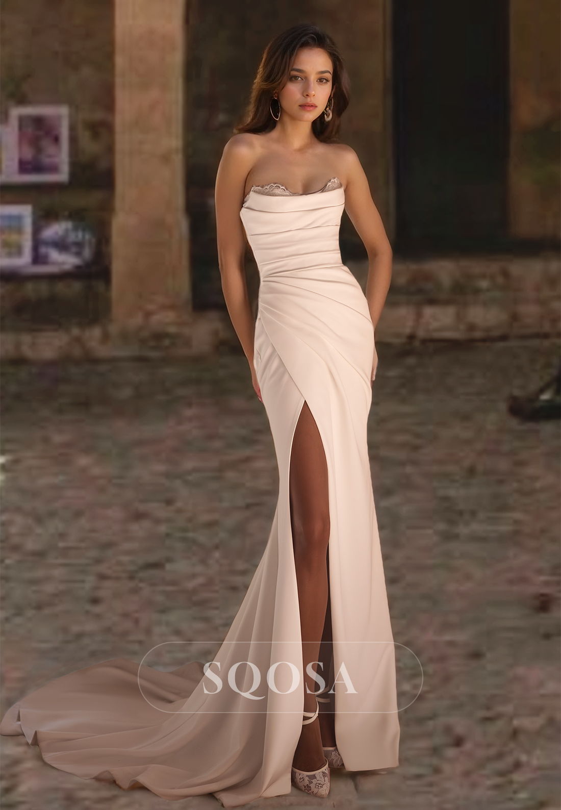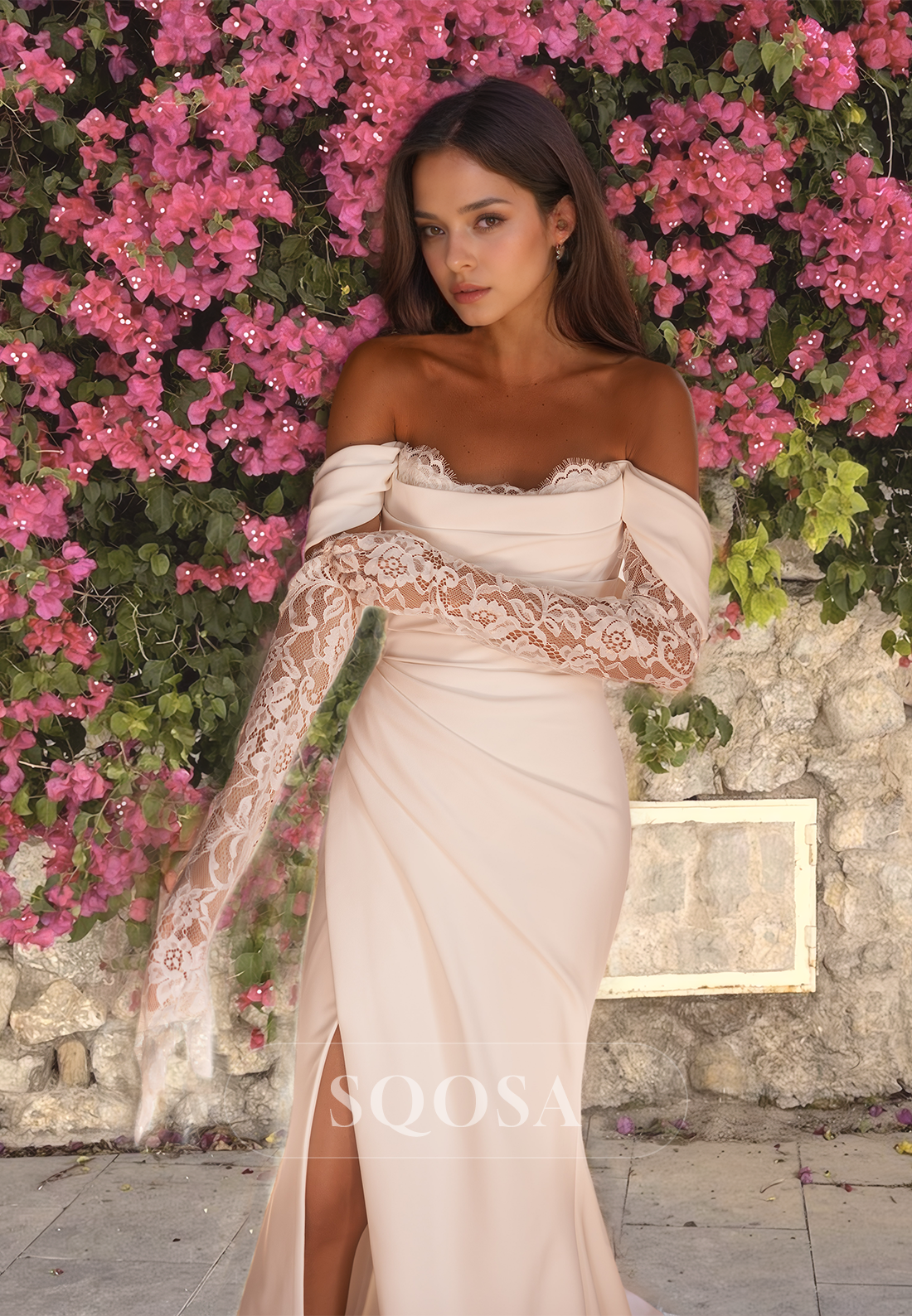 Sweetheart Satin Mermaid Wedding Dress Pleated with Removable Lace Gloves Beach Gowns