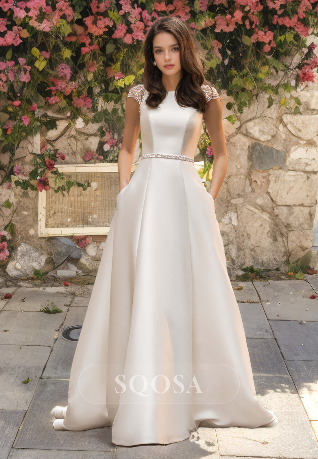 Simple Cap-Sleeves Scoop-Neck Beaded Satin A-Line Wedding Dress with Sweep Train