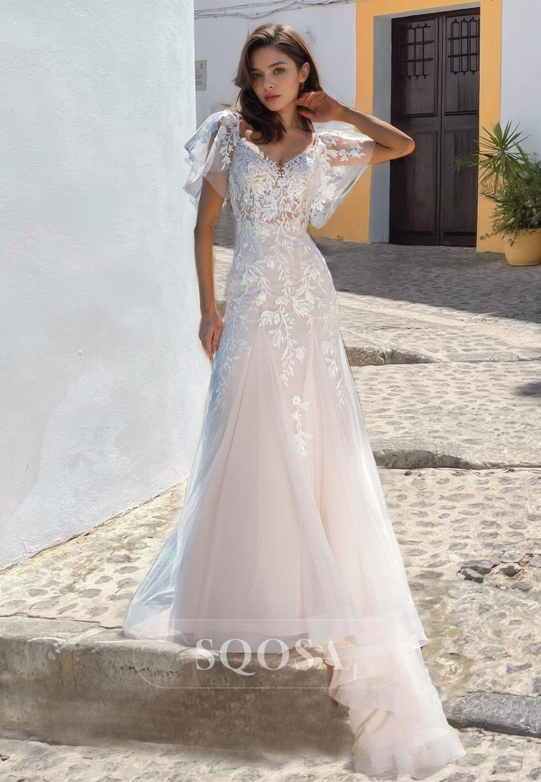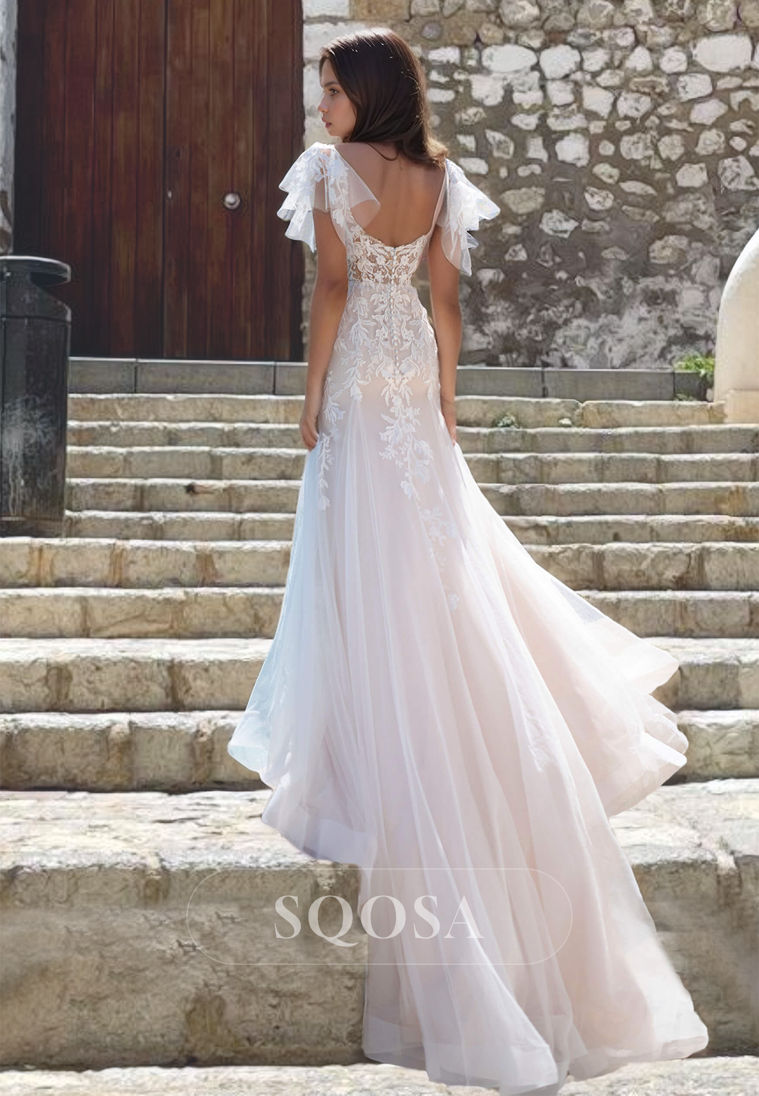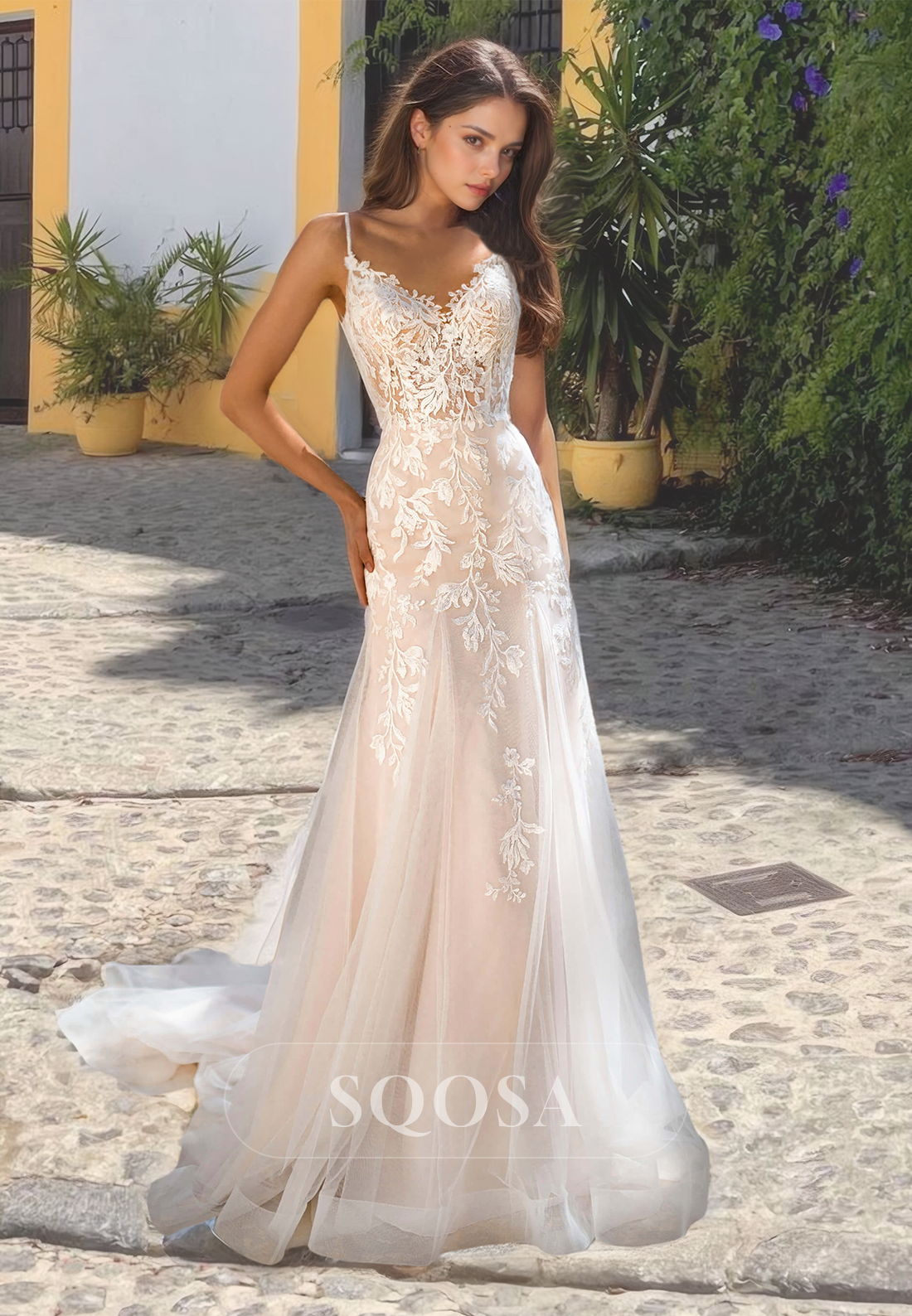 Spaghetti Straps V-Neck Fitted Bride Gowns Sleeveless Cutout Wedding Dress with Applique