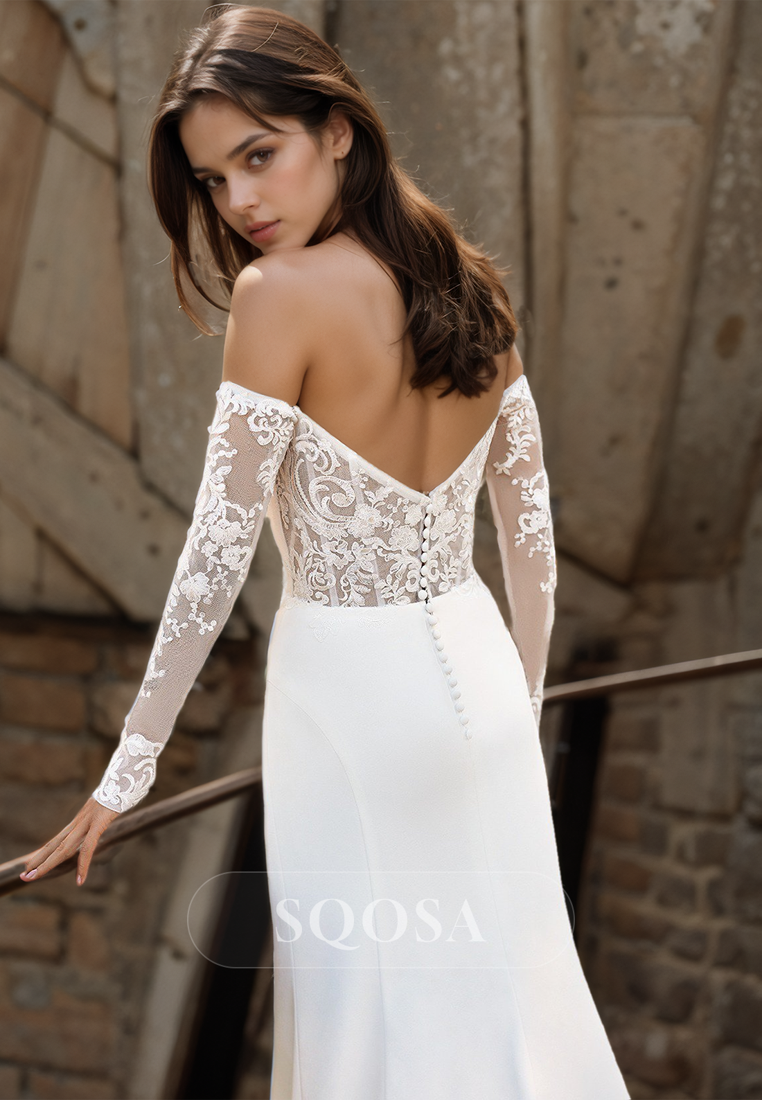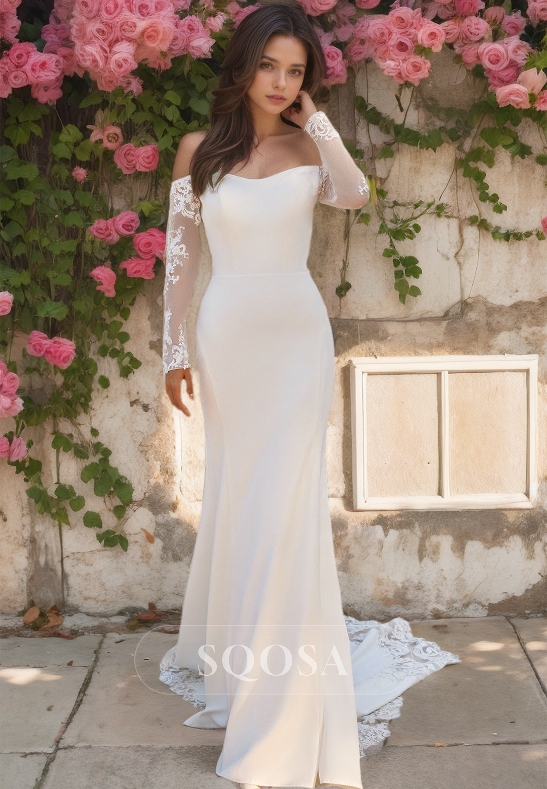 Sweetheart Lace Applique Long Sleeves Bride Dress Off-Shoulder Cutout Mermaid Wedding Dress with Train