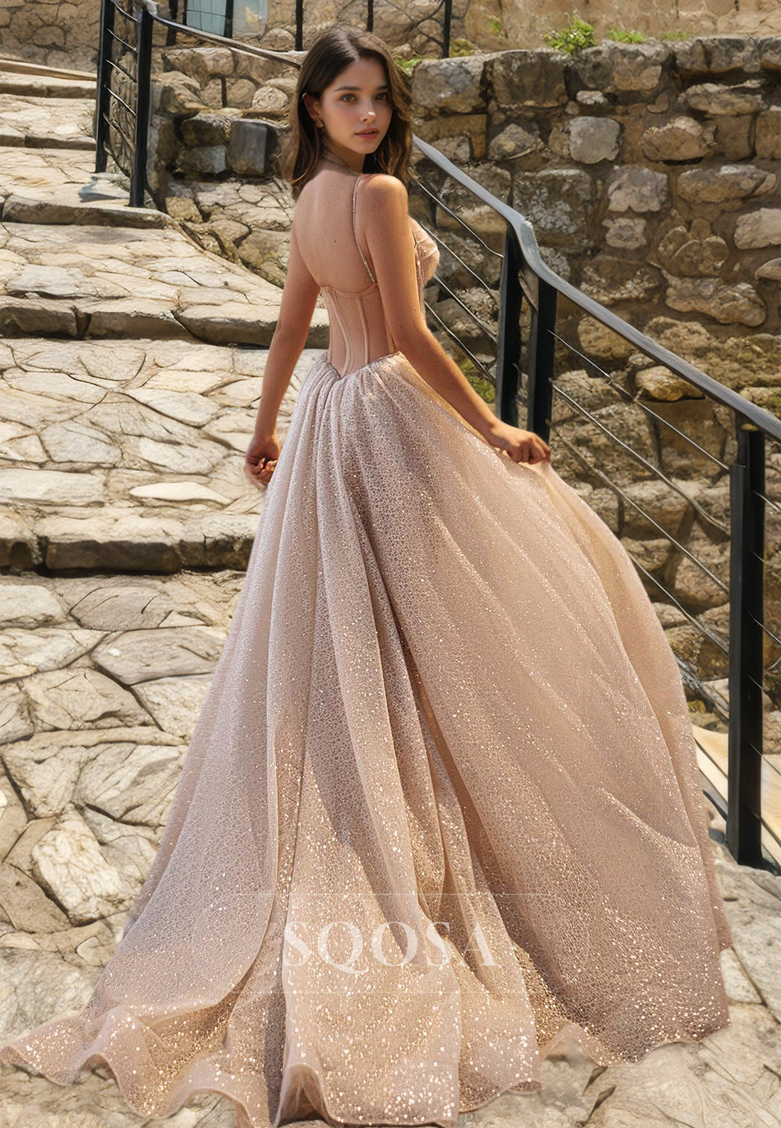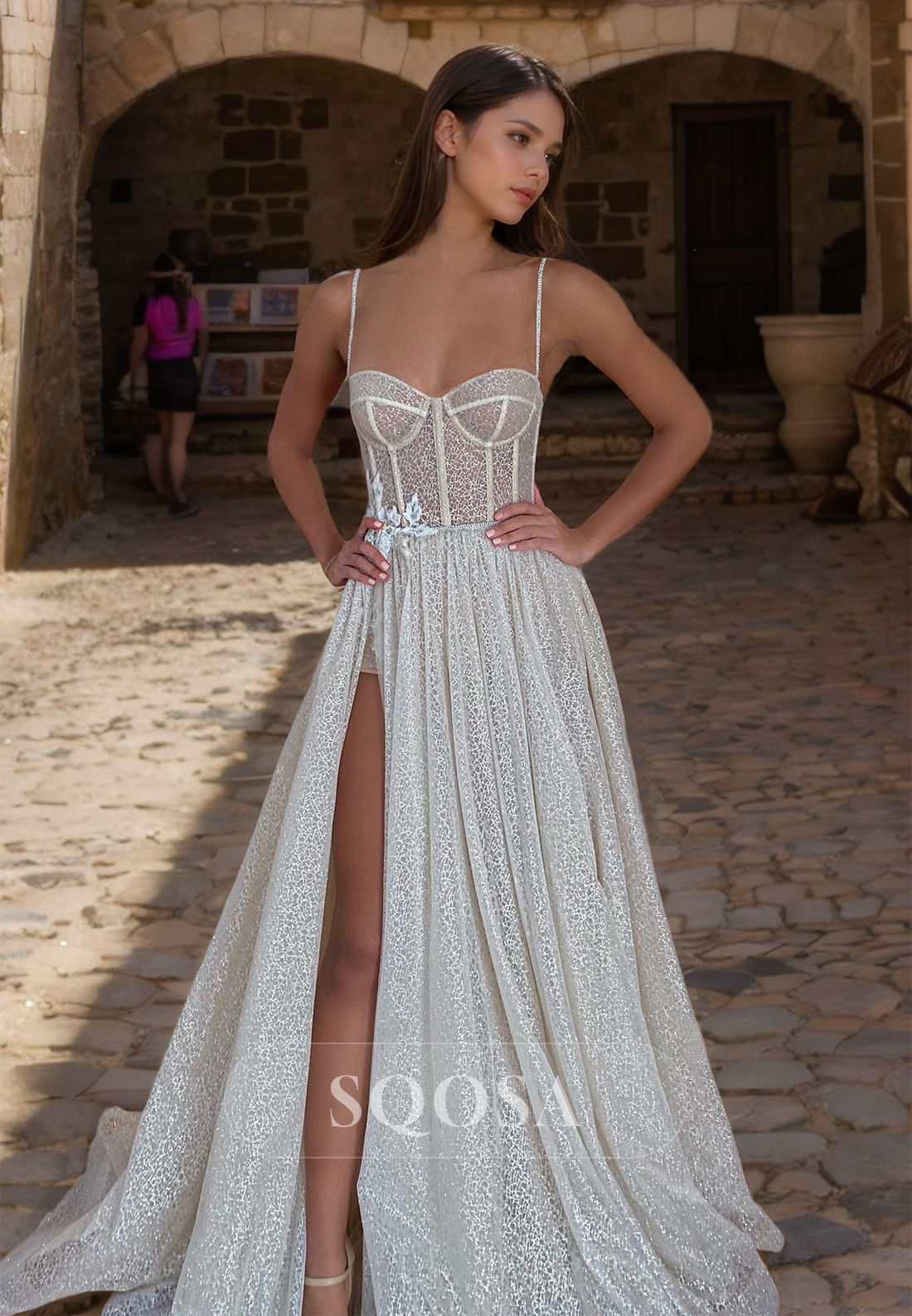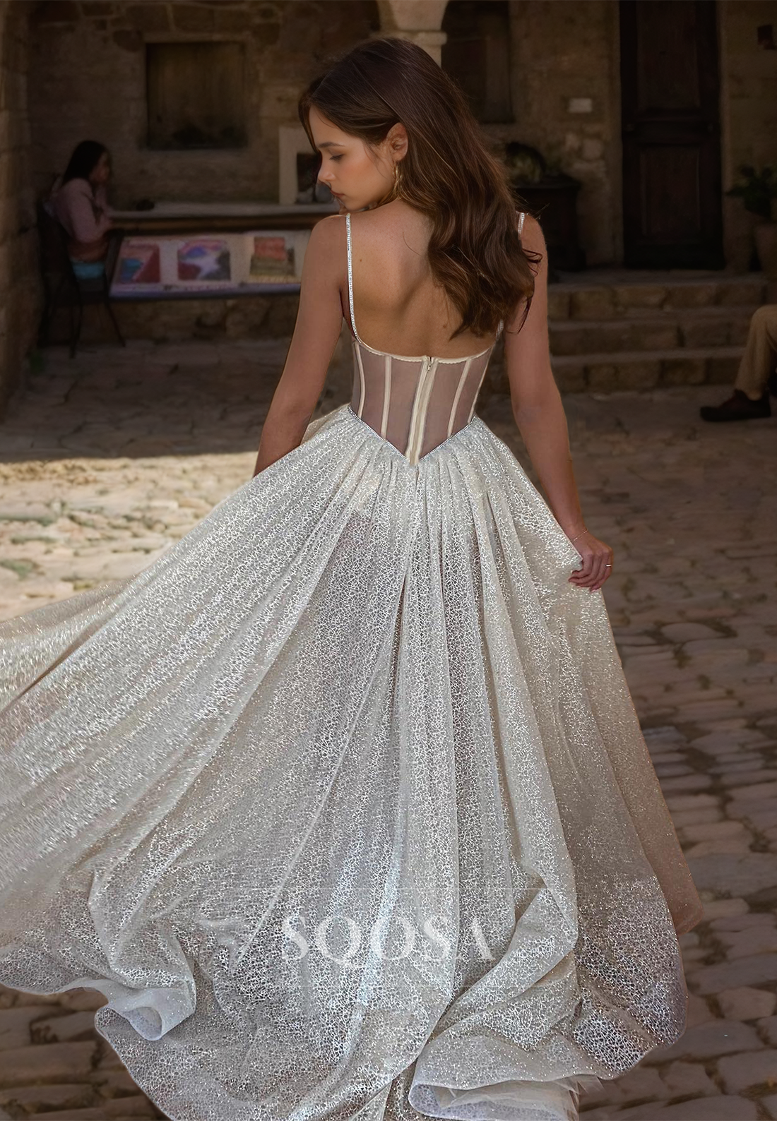 A-Line Spaghetti Straps Beach Bride Dress Sweetheart Sleeveless Glitter-Knit Boho Wedding Dress