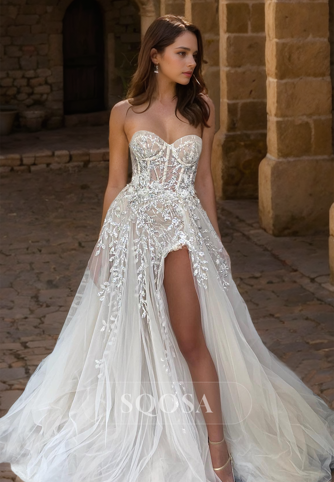 This elegant Sweetheart A-Line Tulle Beach Bride Gowns exudes grace and femininity. The sleeveless design, delicate beading, and intricate appliques create a stunning silhouette. The slit train adds a touch of drama, making it perfect for a beach wedding. Get ready to turn heads on your special day.