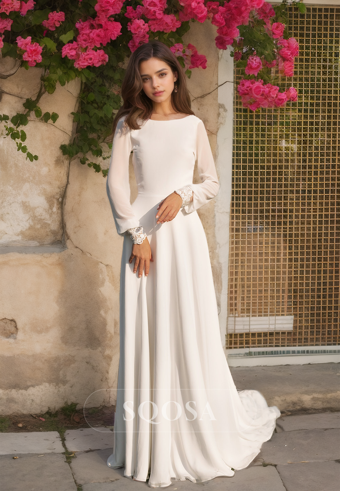 Long-Sleeves Scoop-Neck Chiffon A-Line Train Boho Beach Wedding Dress with Lace Trimmed