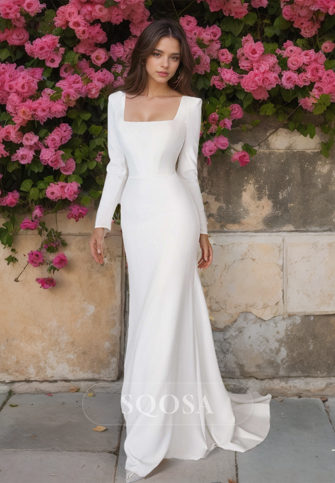 Expertly designed for a beach wedding, this mermaid dress features a square-neck and long sleeves for an elegant and sophisticated look. Made from luxurious satin material, this dress is perfect for the boho bride. Embrace simplicity and grace on your special day.