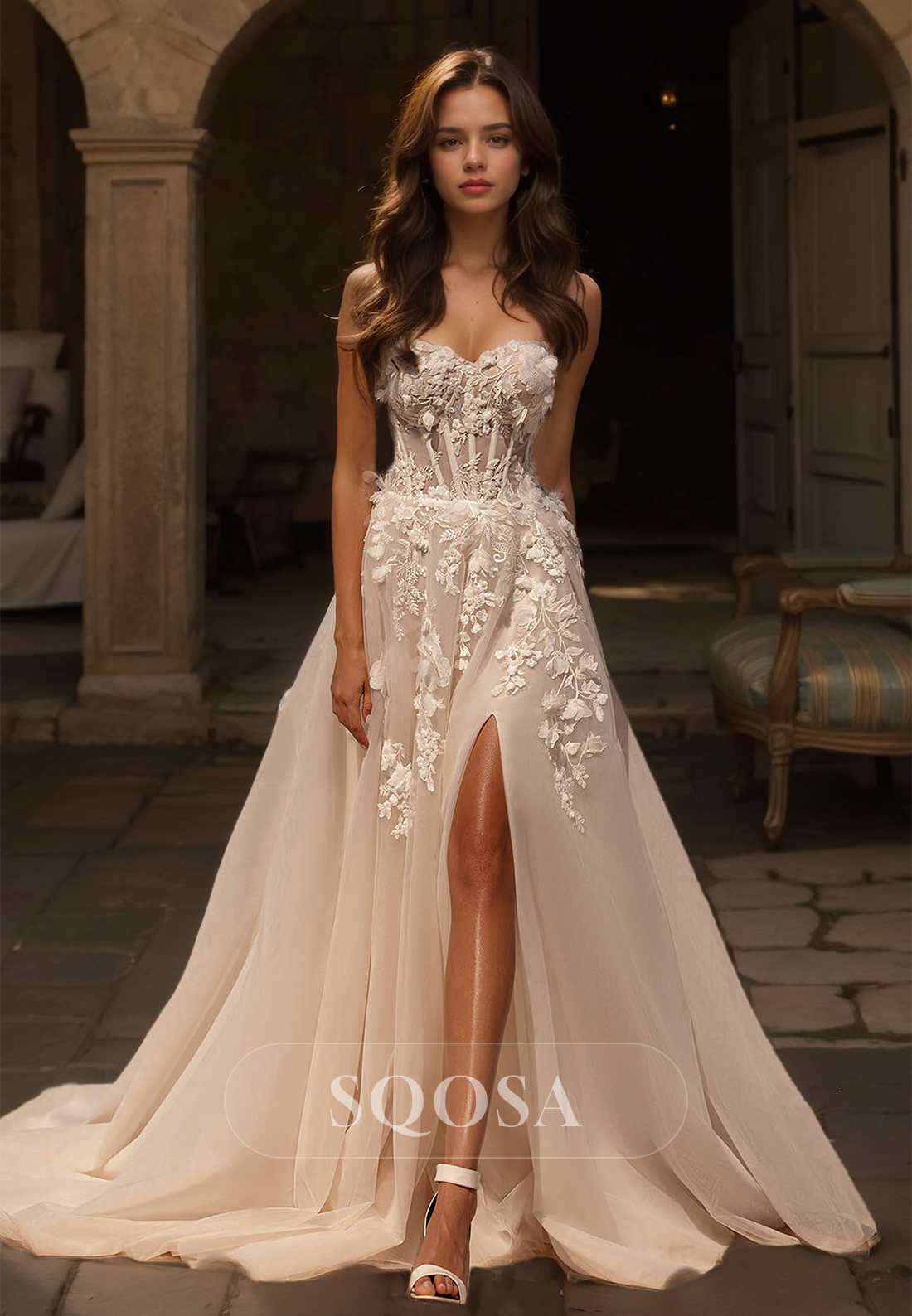 Sweetheart Sleeveless Tulle A-Line Wedding Dress Applique Cutout Slit with Train Bride Dress