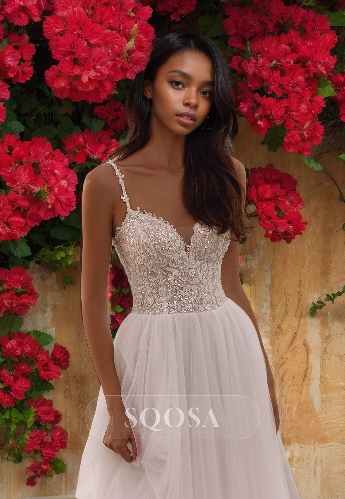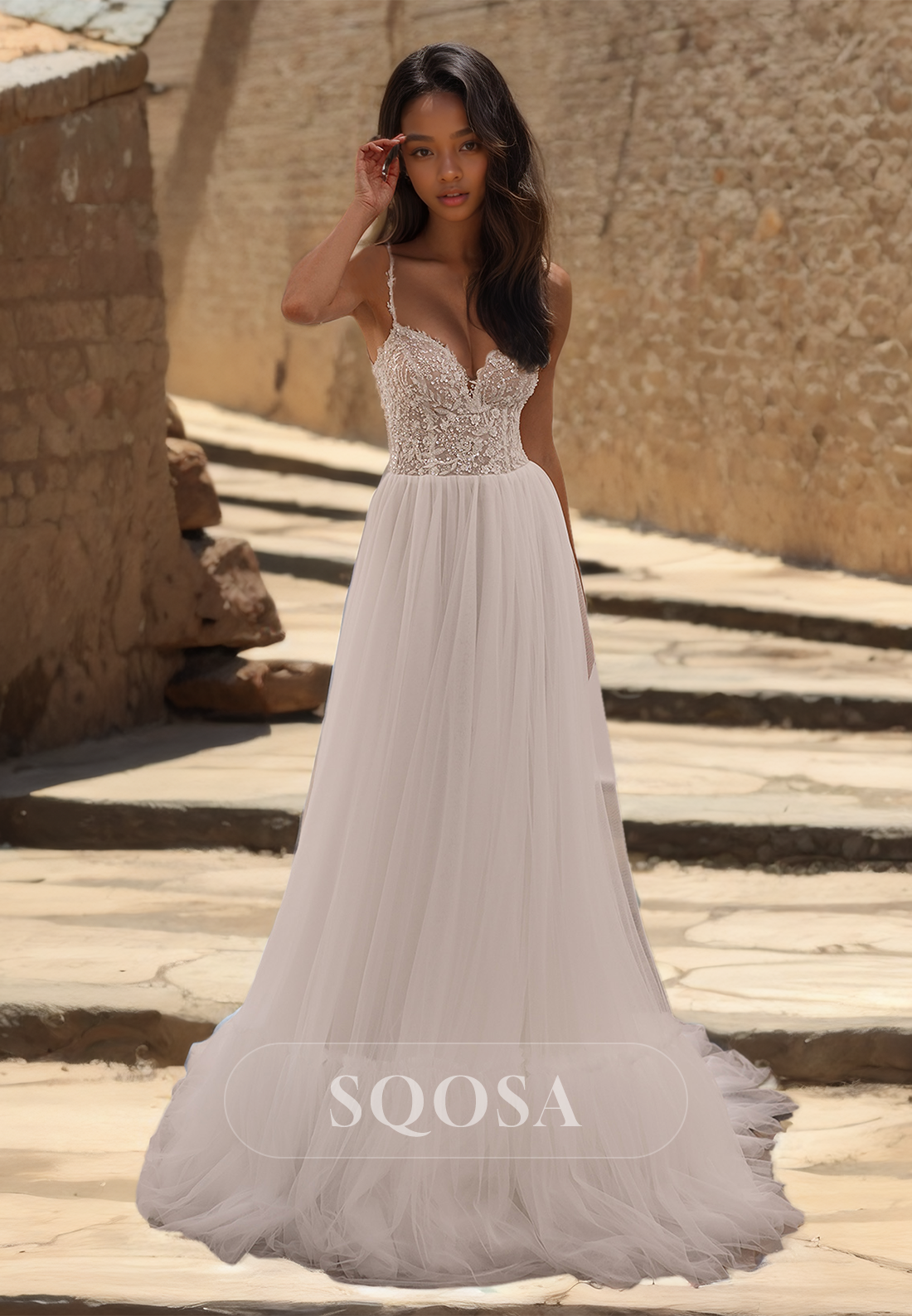 Spaghetti Straps Sleeveless A-Line Bride Gowns Sweetheart Off-Shoulder Beaded Tulle Wedding Dress