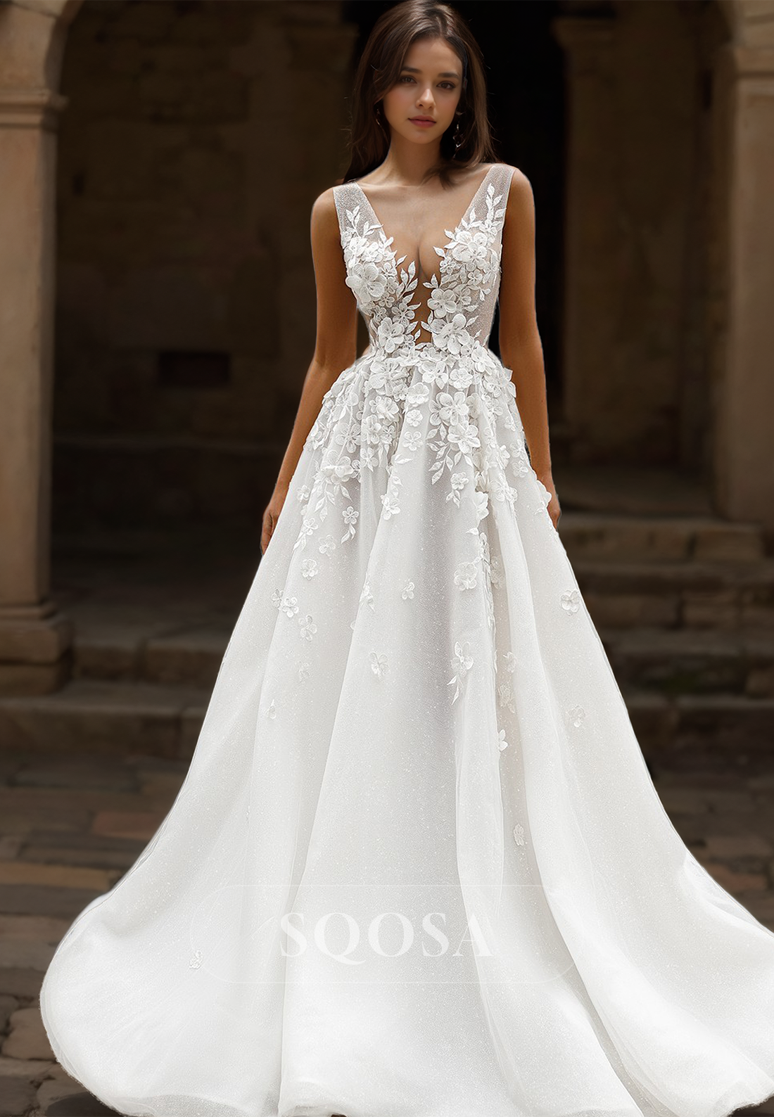 Sleeveless Deep V-Neck Straps Wedding Dress Glitter-Knit with Applique Train Bride Gowns