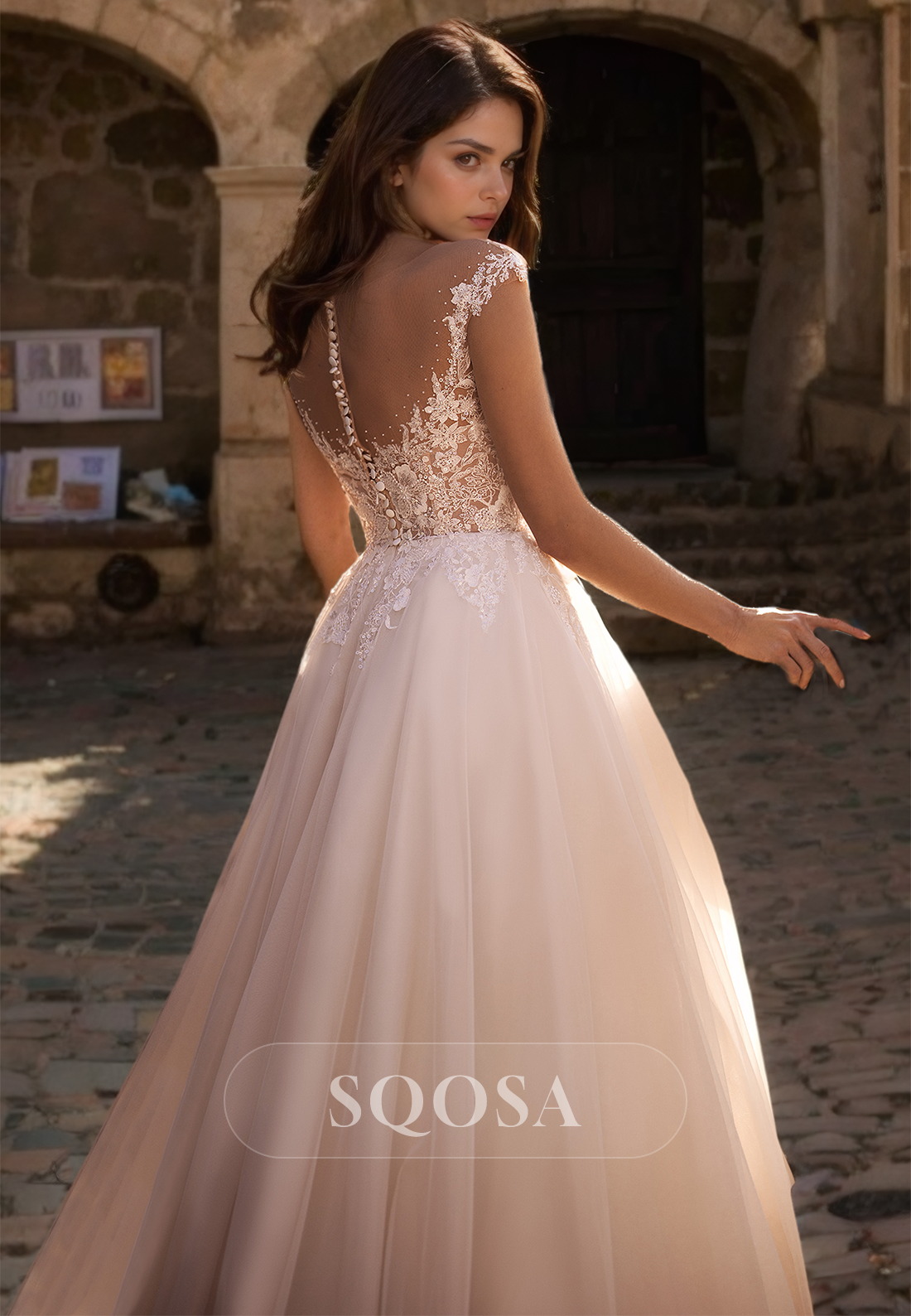 Scoop-Neck Cutout Cap-Sleeves A-Line Wedding Dress Applique Beaded Bride Dress with Train