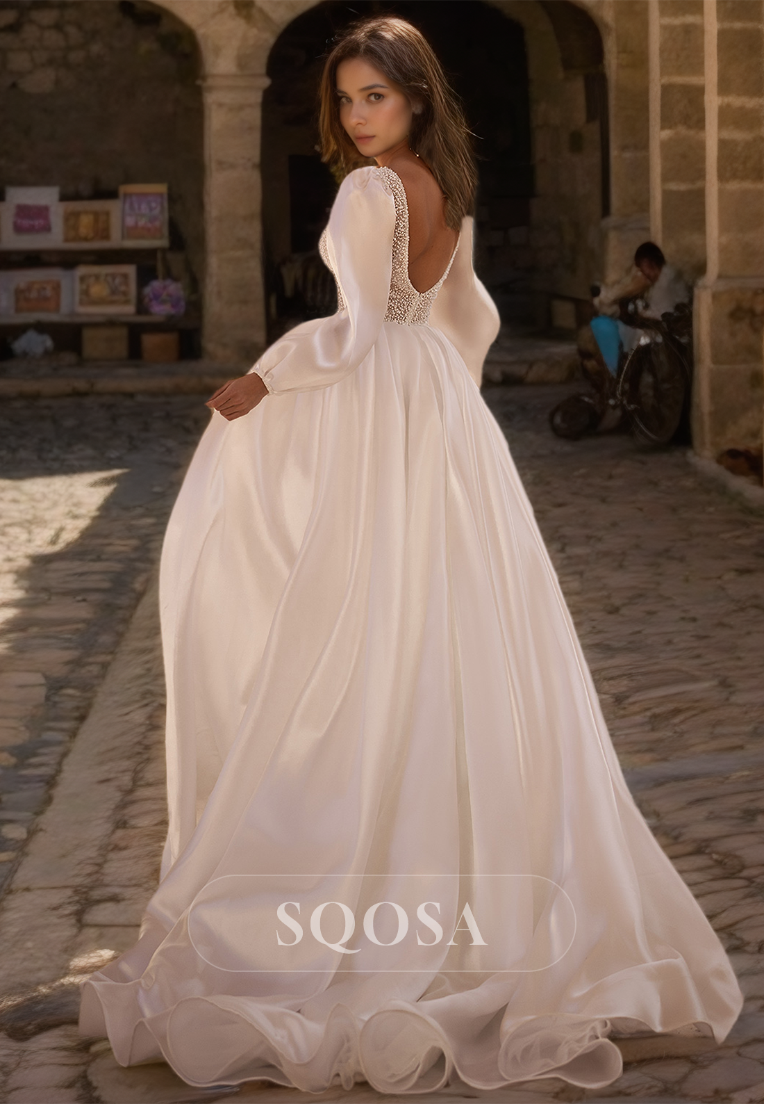 Deep V-Neck Long-Sleeves A-Line Bride Gowns Beaded Pleated Train Chiffon Wedding Dress