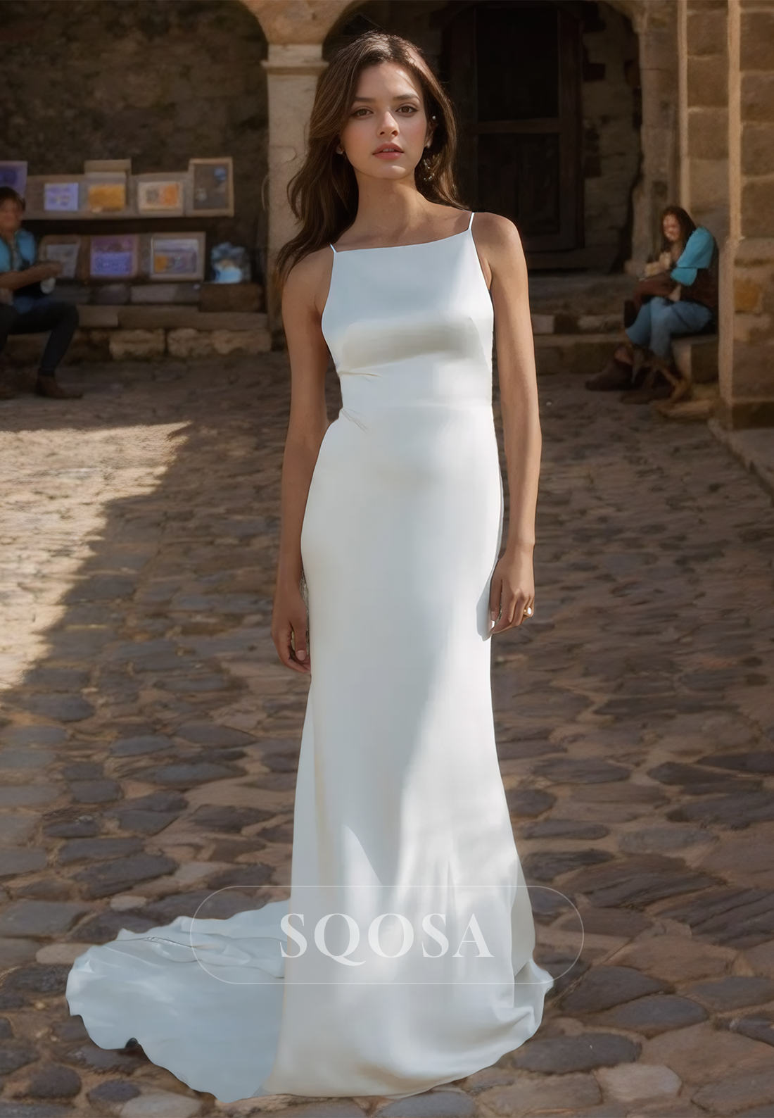 Spaghetti Straps Sleeveless Satin Wedding Dress Off-Shoulder Mermaid Bride Gowns with Train