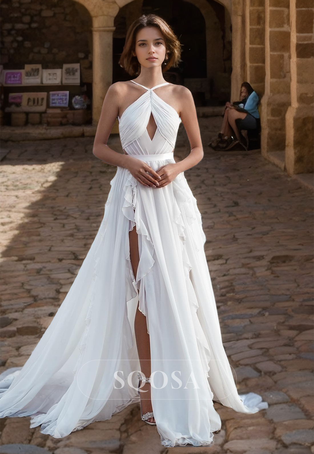 Halter-Neck Spaghetti Straps Pleated Bride Dress Cutout Chiffon A-Line Boho Wedding Dress with High Slit x 1;