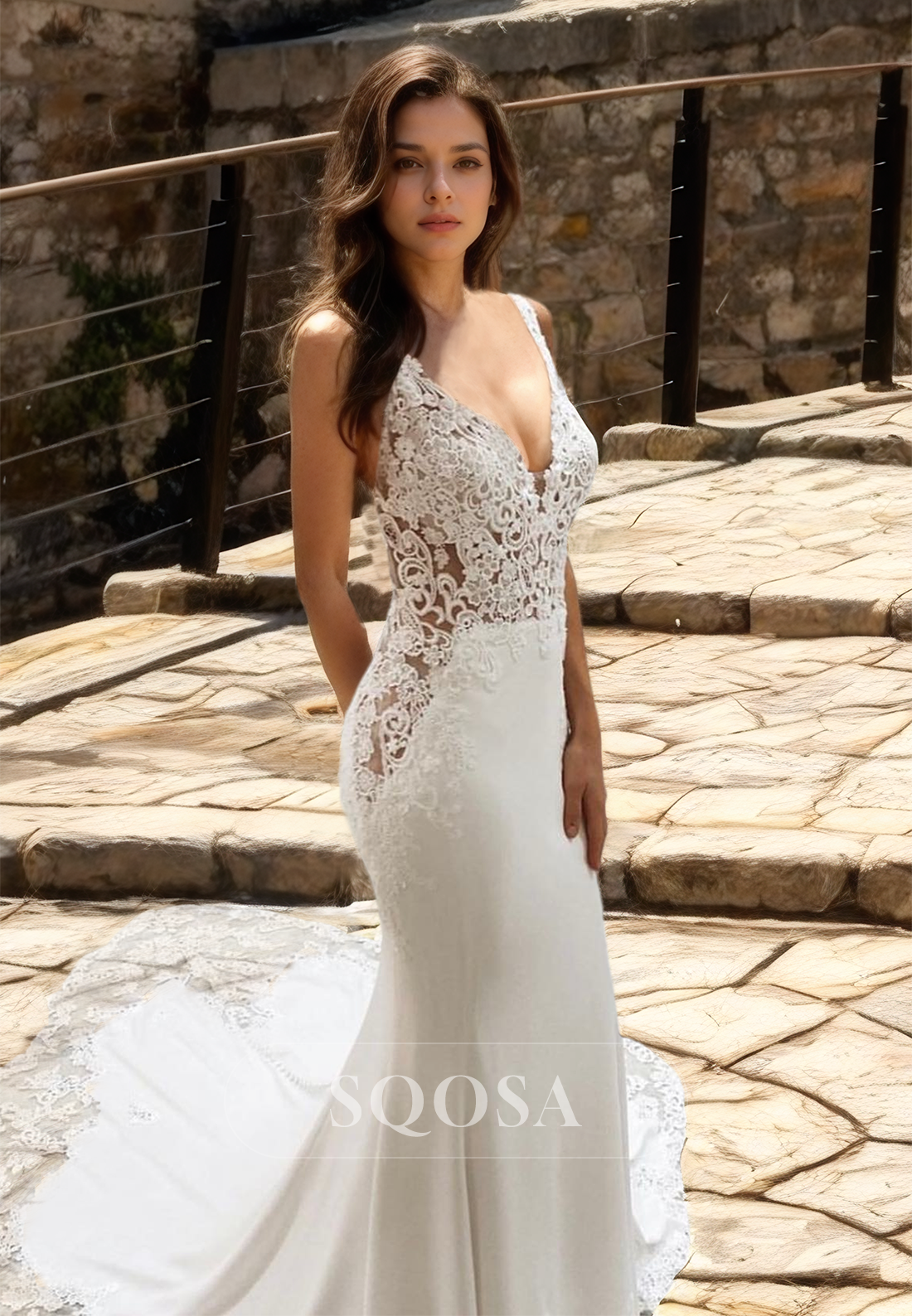Spaghetti Straps Deep V-Neck Lace Memaid Wedding Dress Sleeveless Applique Cutout Bride Gowns