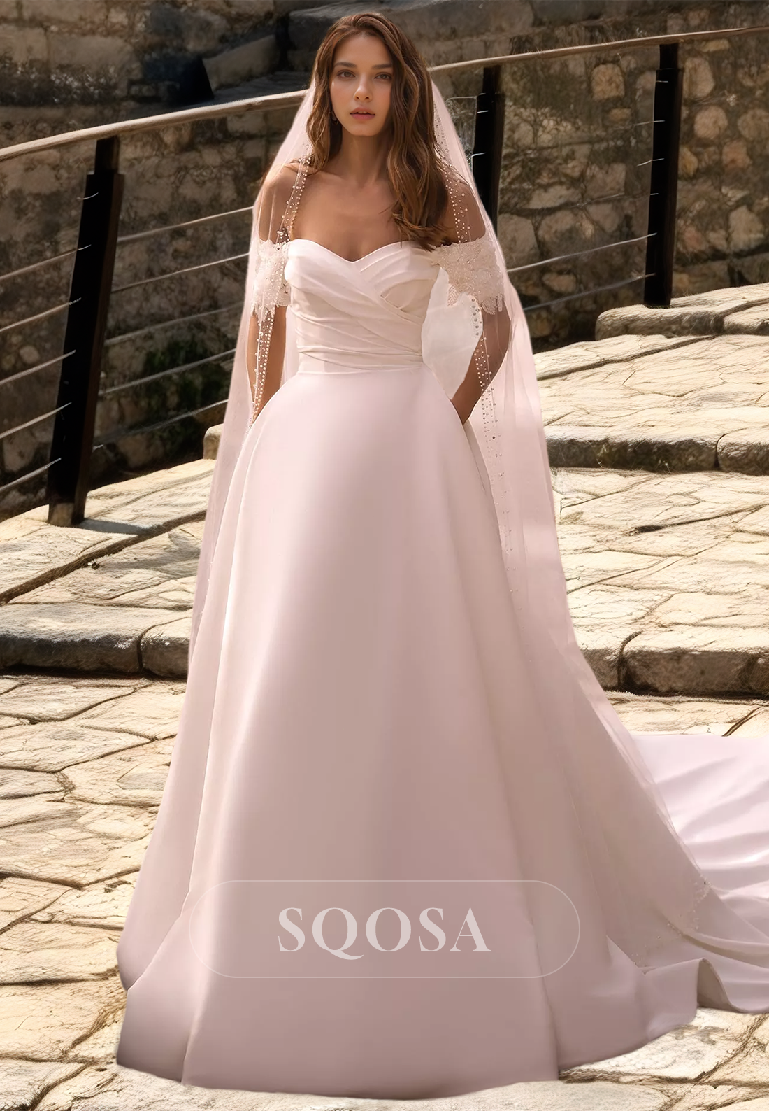 Sweetheart Sleeveless Pleated A-Line Wedding Dress Beaded Fringe Train Bride Gowns with Overlay