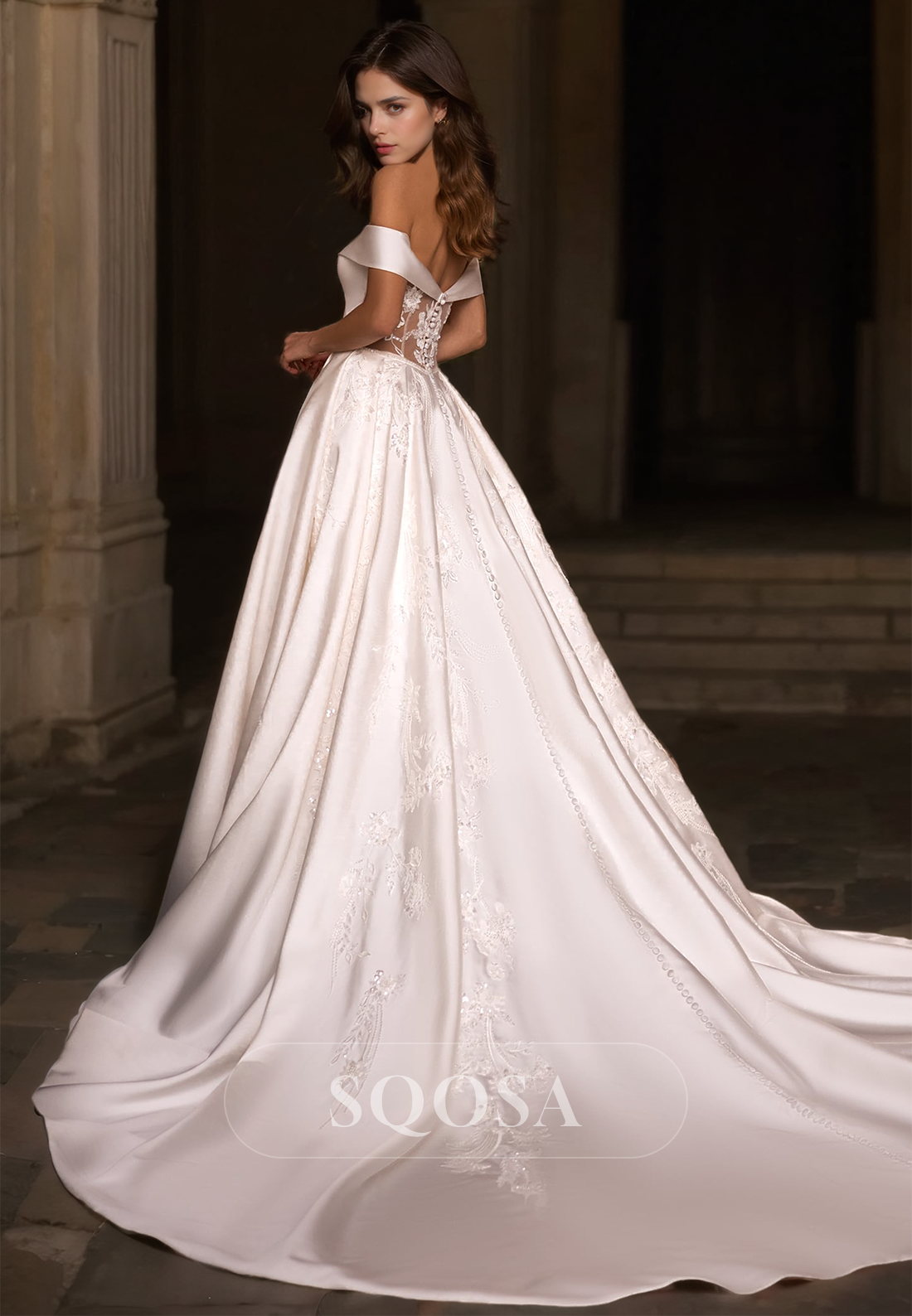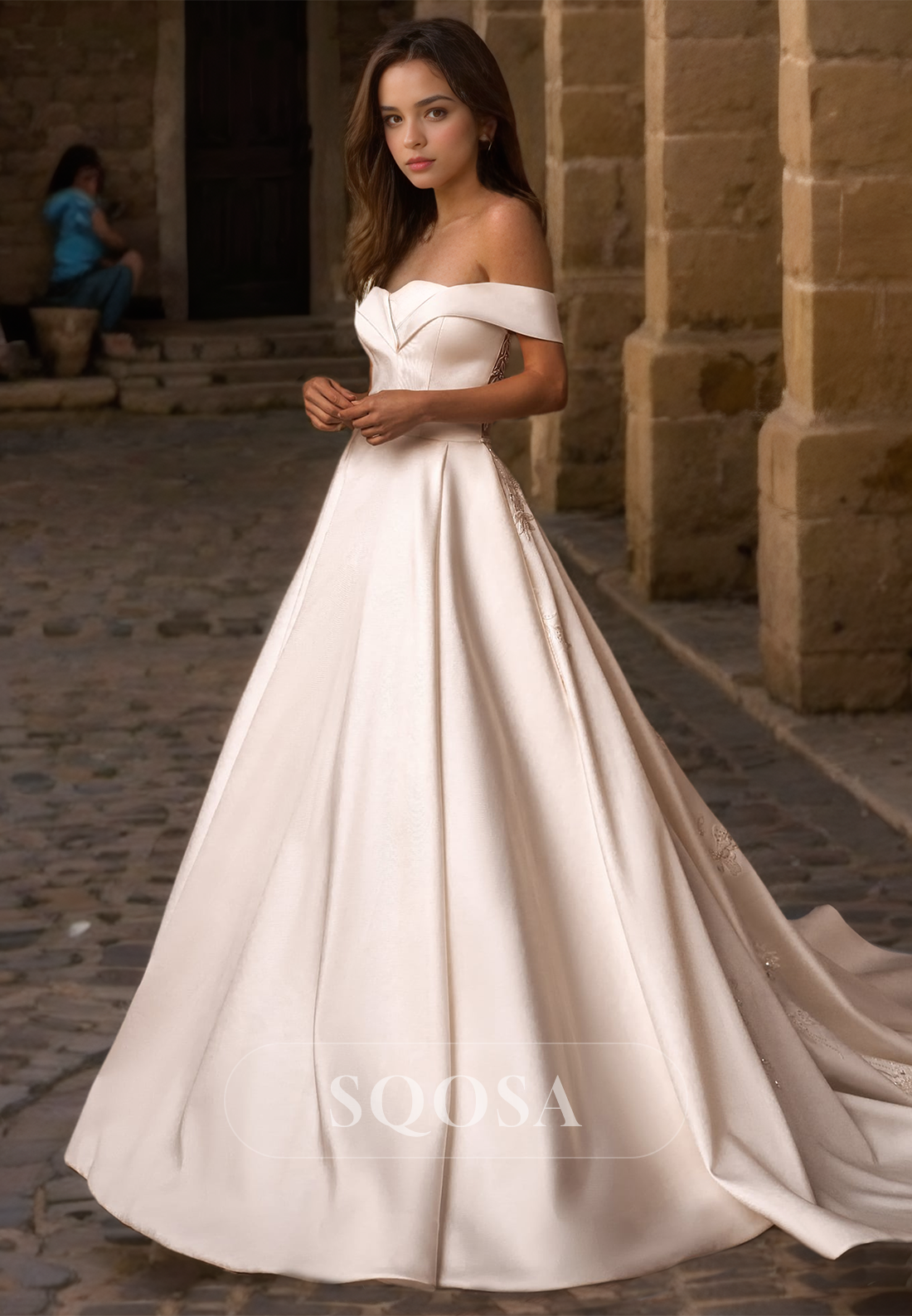 A-Line Sweetheart Off-Shoulder Bride Dress Applique Cutout Wedding Dress with Train