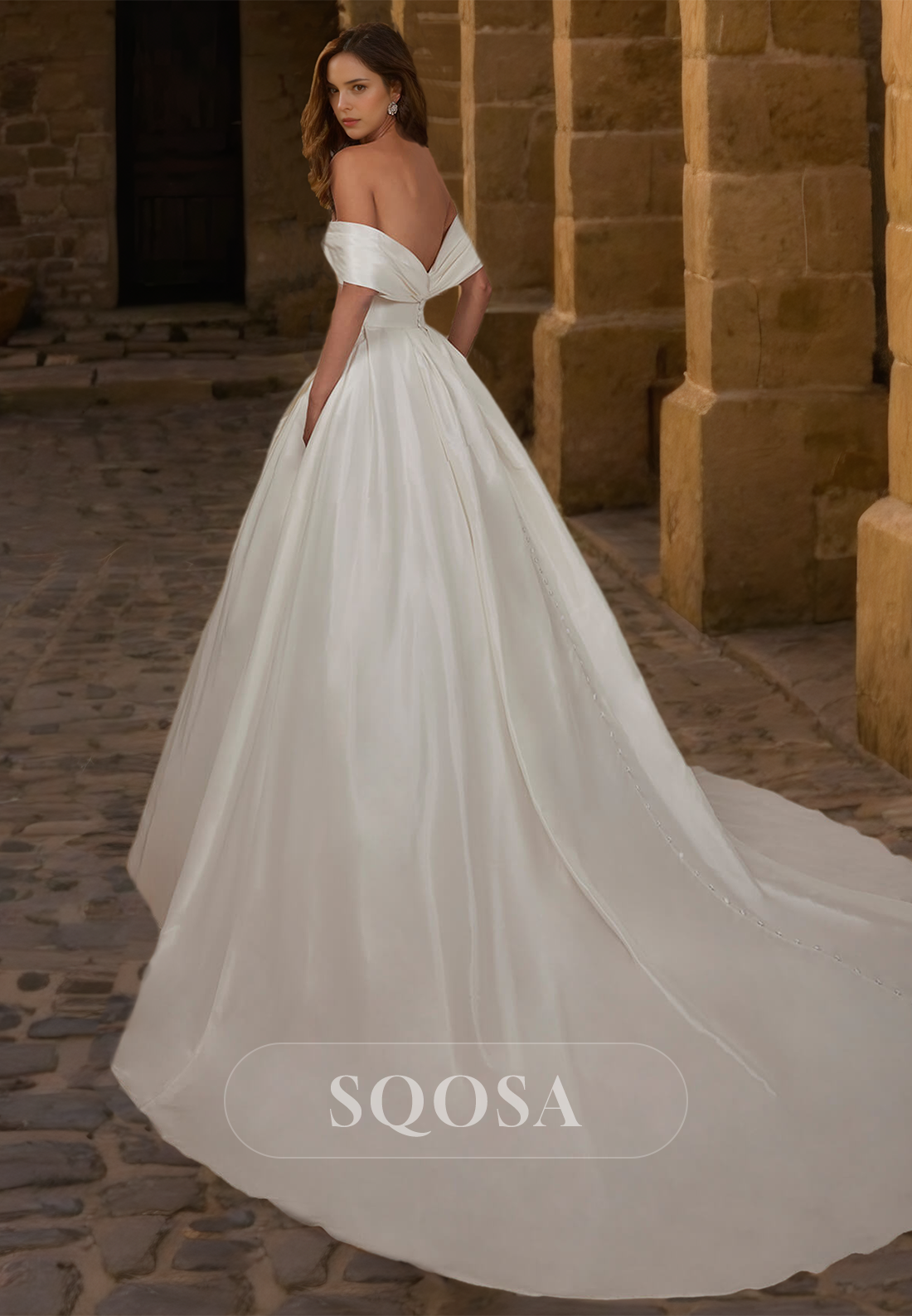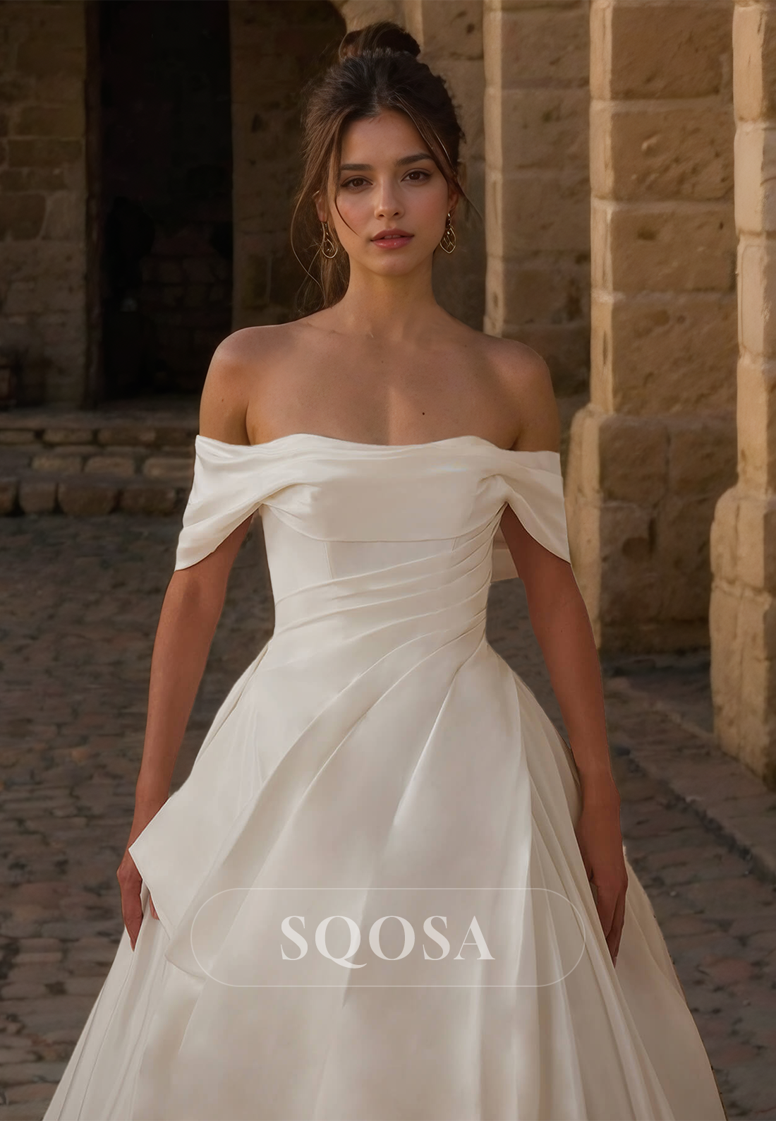 This elegant wedding dress features an off-shoulder design and a pleated A-line silhouette, highlighting your figure with grace and sophistication. The tube top and sleeveless design add a modern touch, while the train adds a touch of traditional bridal glamour. Simple yet stunning, this dress is perfect for the modern bride.