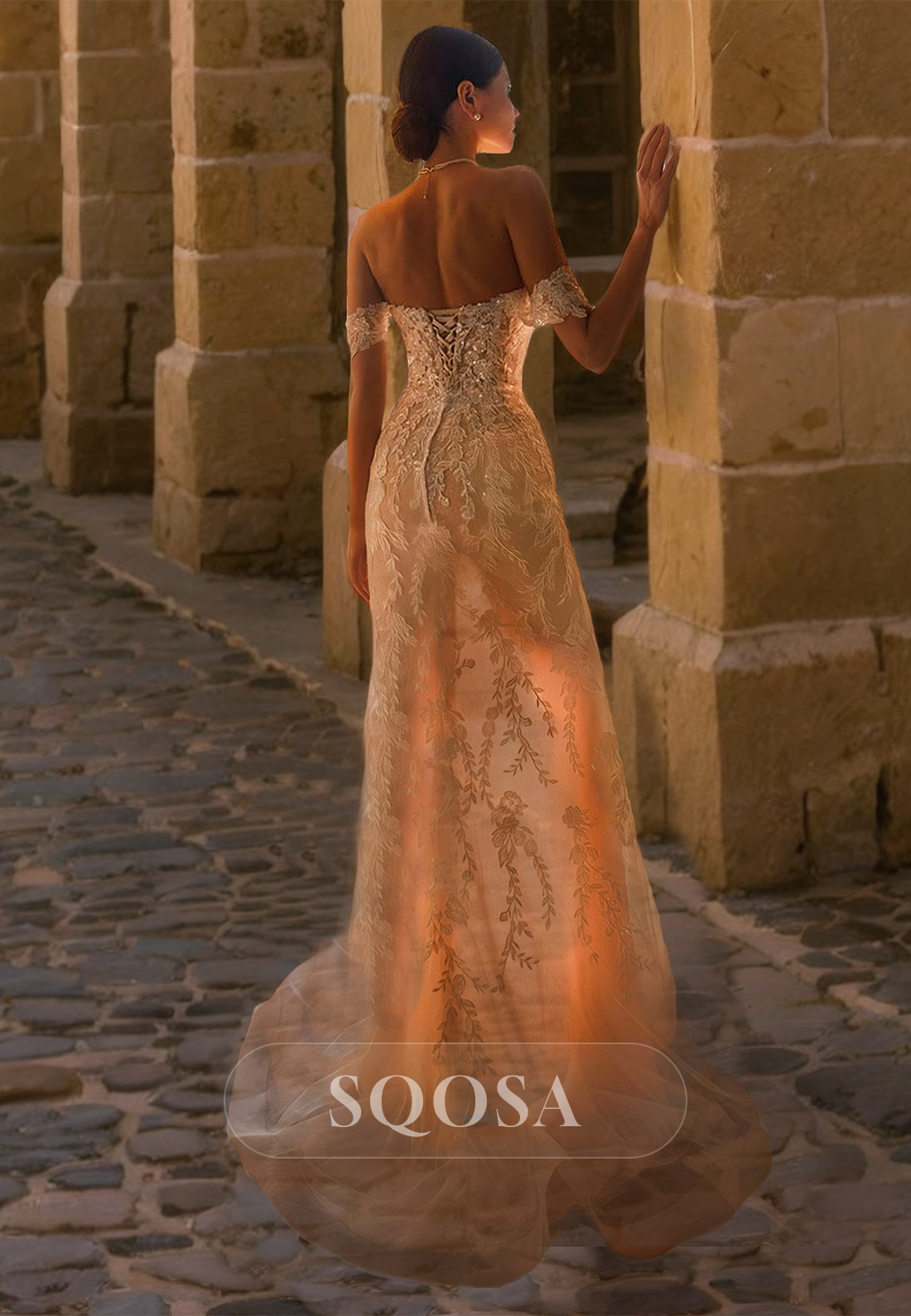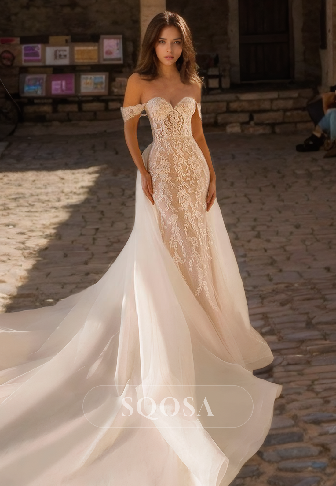 Sweetheart Sleeveless Beaded Allover Lace Applique Mermaid Wedding Dress with Chiffon Overskirt