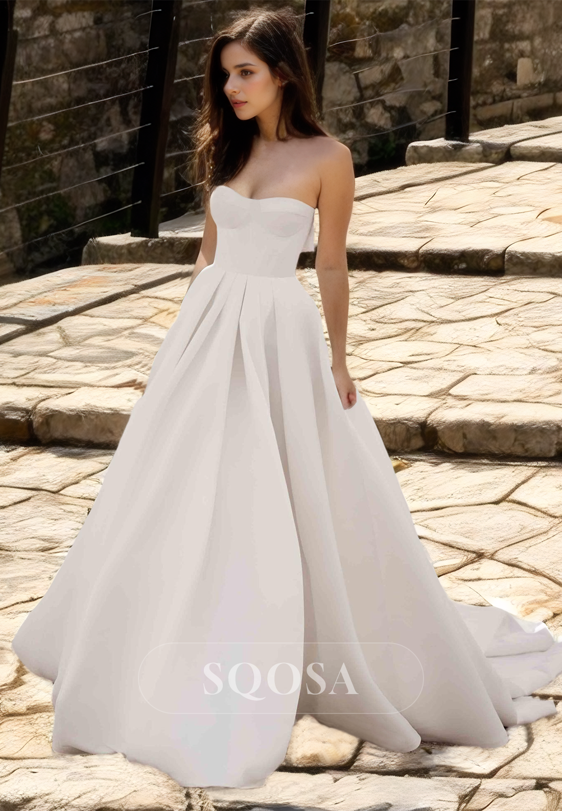 Simple Sweetheart Off-Shoulder A-Line Boho Wedding Dress Pleated Sweep Train Beach Bride Gowns x 1;
