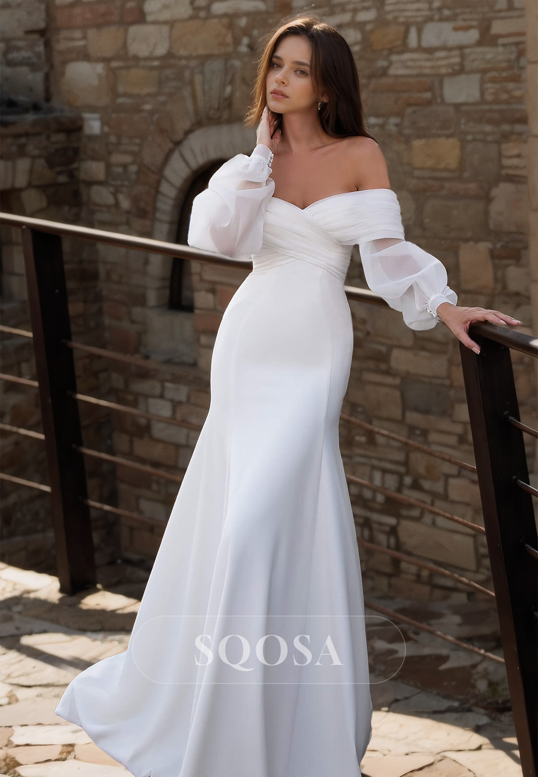 Pleated V-Neck Long-Sleeves Mermaid Beach Wedding Dress Sheer Train Chiffon Boho Bride Gowns