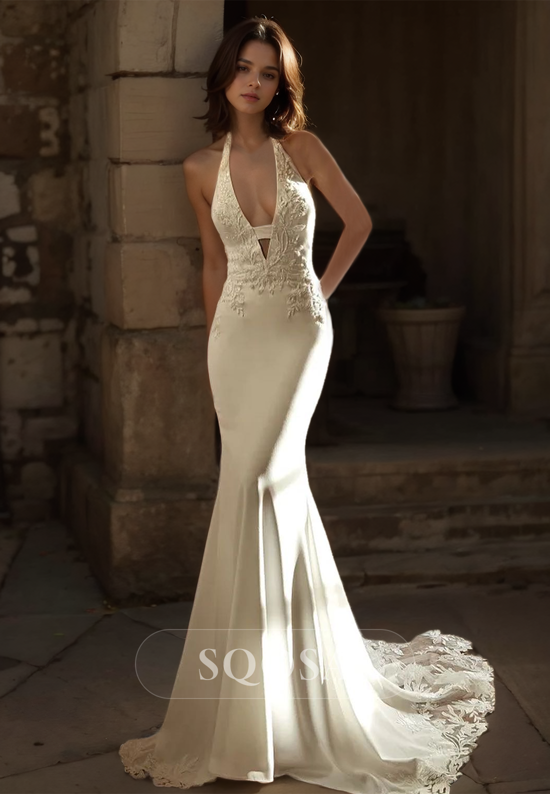 Halter Deep V-Neck Sleeveless Off-Shoulder Beaded Applique Cutout Lace Train Mermaid Wedding Dress