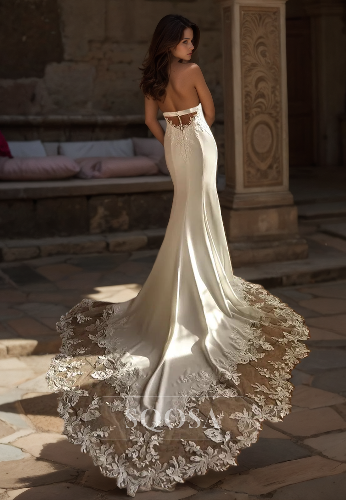 This Halter Deep V-Neck Sleeveless Off-Shoulder Beaded Applique Cutout Lace Train Mermaid Wedding Dress exudes elegance and sophistication. The deep v-neck and mermaid train showcase a timeless silhouette, while the beaded applique and cutout lace add intricate details. Perfect for a bride looking for a chic and glamorous look on her special day.