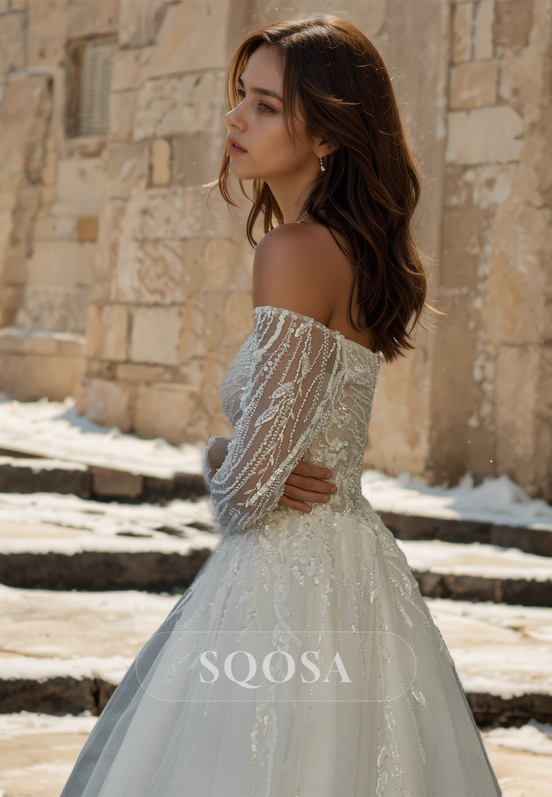Sweetheart Long-Sleeves Tulle Bride Gowns Beaded Applique Cutout A-Line Wedding Dress