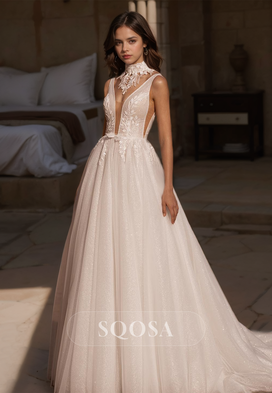 Spaghetti Straps Deep V-Neck A-Line Wedding Dress Sleeveless Glitter-Knit Pleated Applique Bride Dress