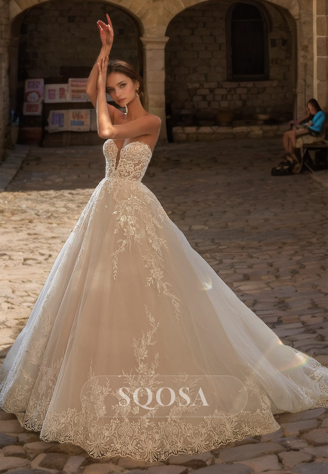 Sweetheart Plunging V-Neck Sleeveless Tulle S-Line Wedding Dress Lace Applique Beaded Sweep Bride Gowns