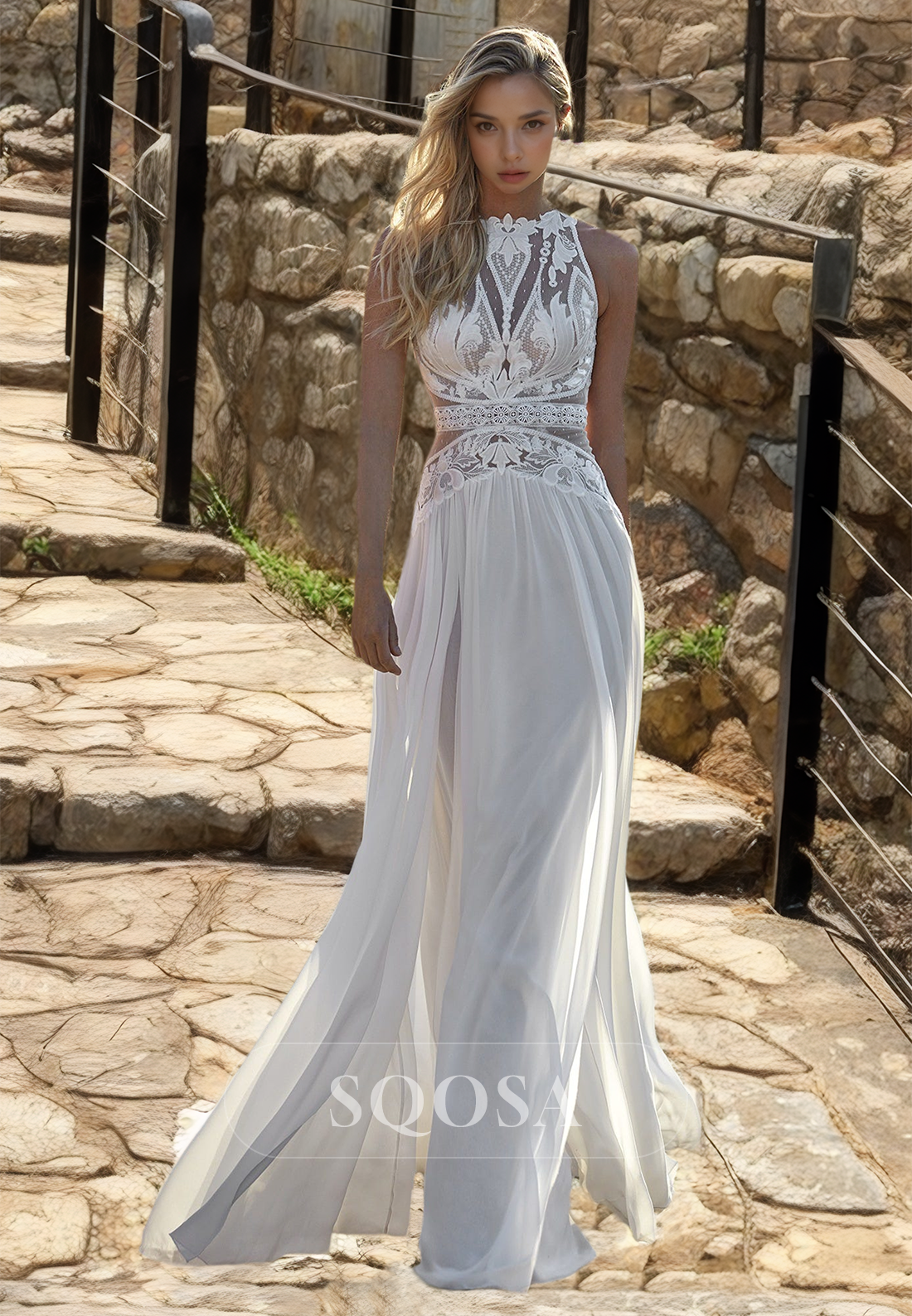 High Scoop-Neck Sleeveless Fitted Bride Gowns Lace Applique Sheer Floor-Length Tulle Wedding Dress