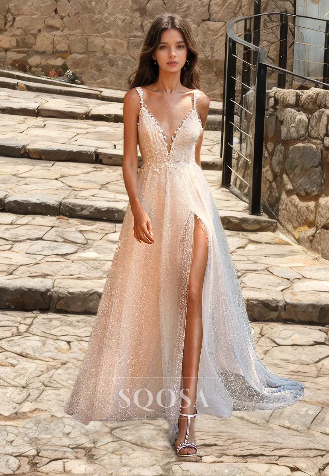 Deep V-Neck Spaghetti Straps A-Line Wedding Dress Glitter-Knit Beaded Floor-Length Slit Beach Bride Gowns