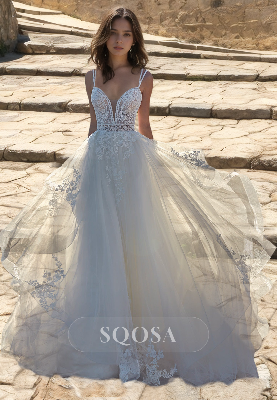 Plunging V-Neck Spaghetti Straps Tulle A-Line Wedding Dress Beaded Applique Boho Beach Bride Gowns with Train