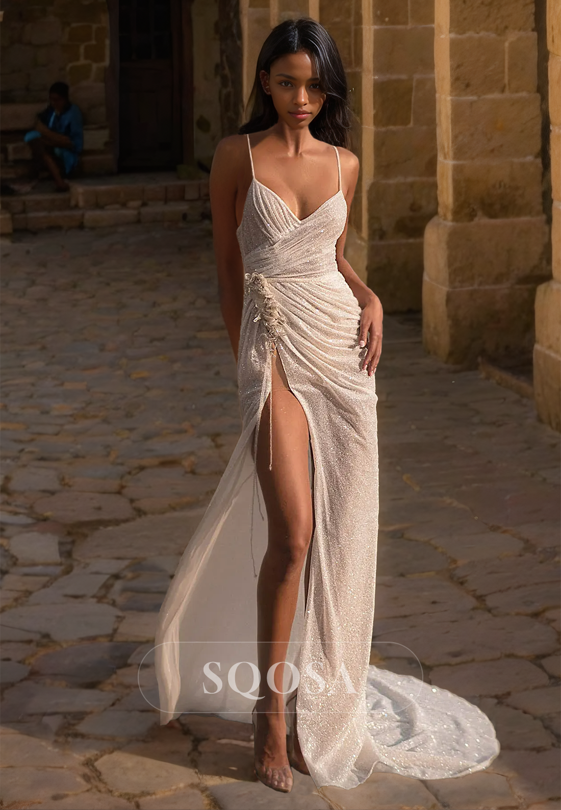 Spaghetti Straps Pleated V-Neck Fitted Boho Wedding Dress High Slit Sweep Train Glitter-Knit Beach Bride Gowns