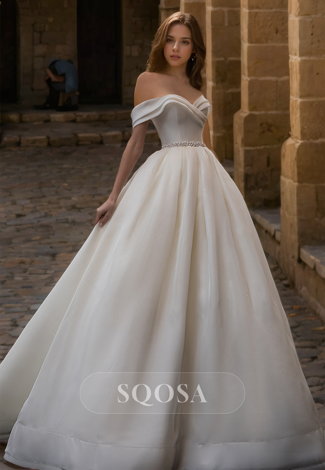 This elegant A-line wedding dress features a pleated sweetheart neckline and an off-shoulder design, adding a touch of romance and sophistication. The beaded detailing and flowy pleated chiffon fabric create a flattering silhouette, perfect for any bride. Complete with a train, this dress is the perfect choice for a dreamy wedding day look.