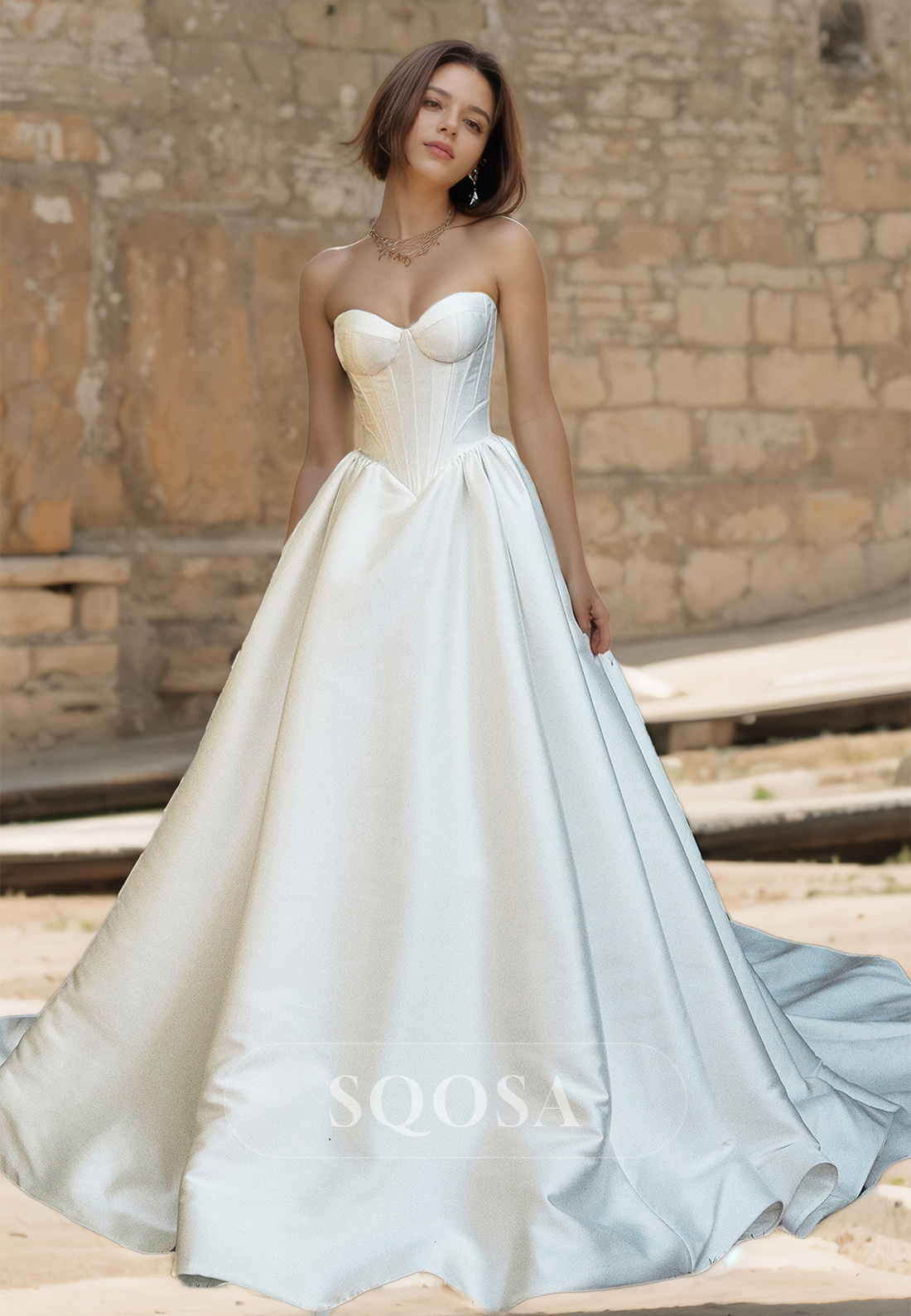 Simple Sweetheart Off-Shoulder Sleeveless Pleated Satin A-Line Wedding Dress with Train